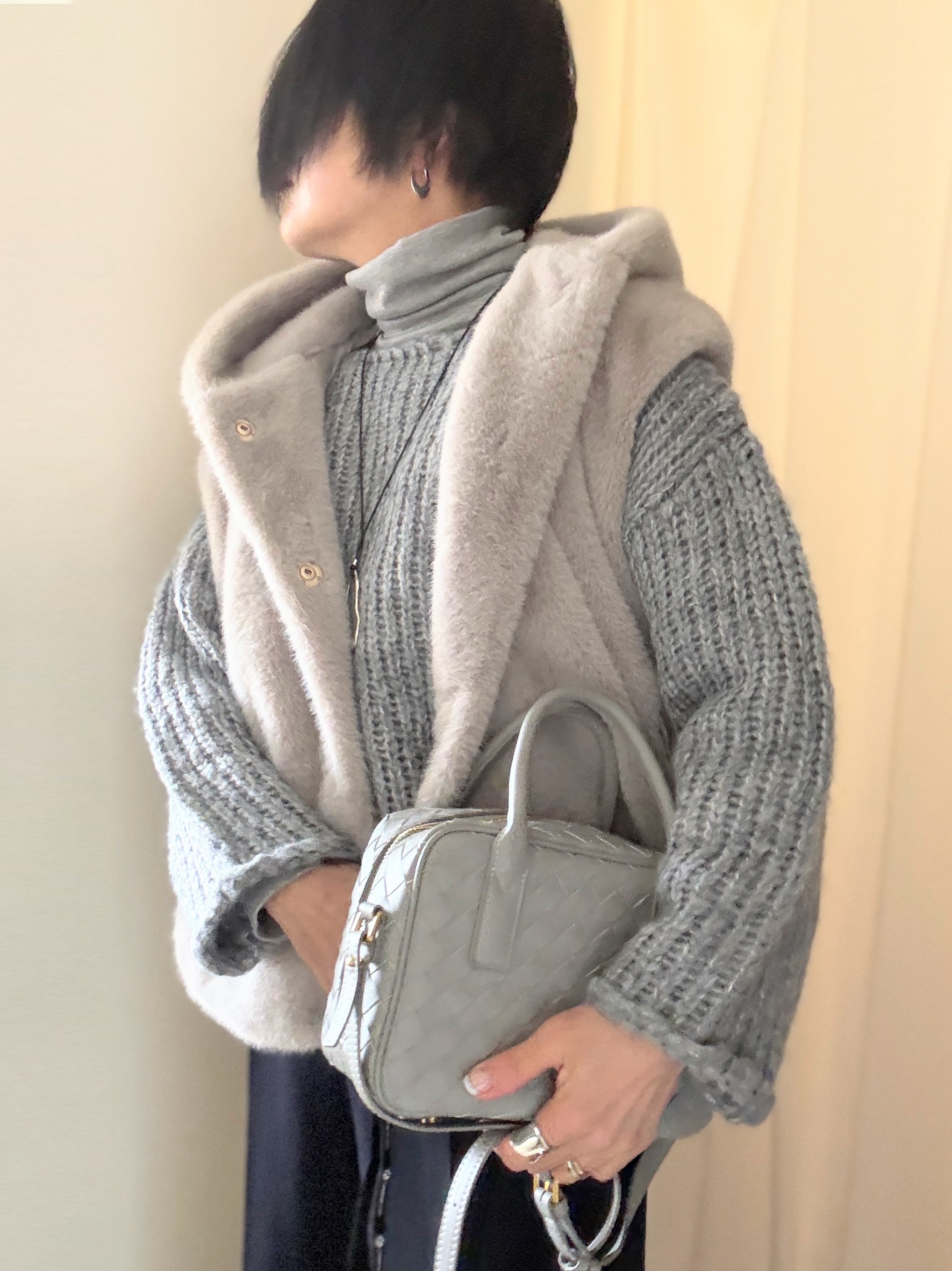 シャギーニット+びよーんと伸びて足さばきも楽なニットタイトスカートの組み合わせ。車に乗っていてもノンストレス。(おトイレしやすいし。)