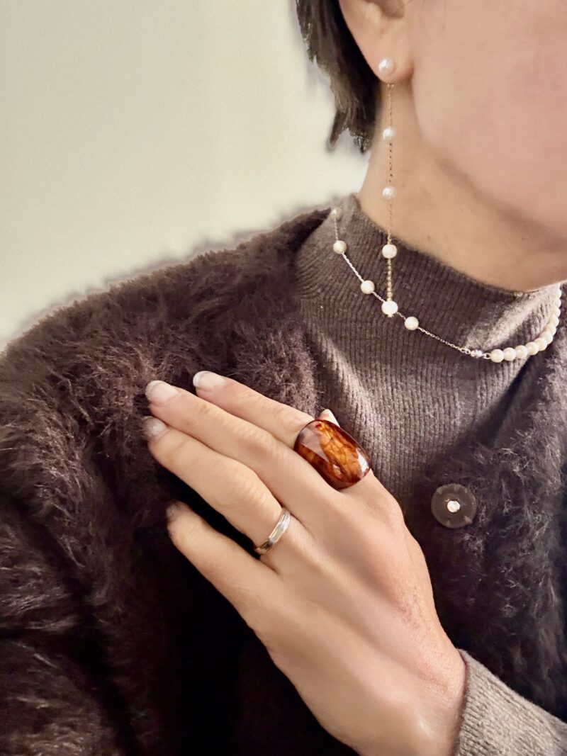 ・指輪:マーブルボリュームリング べっ甲風 ANOH指輪までパールにするとしつこいのでこういう時はべっ甲柄。