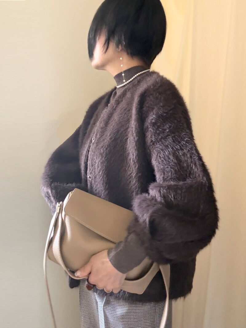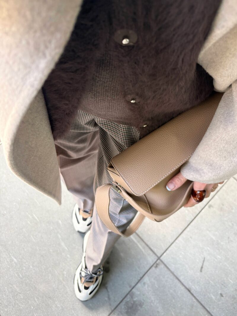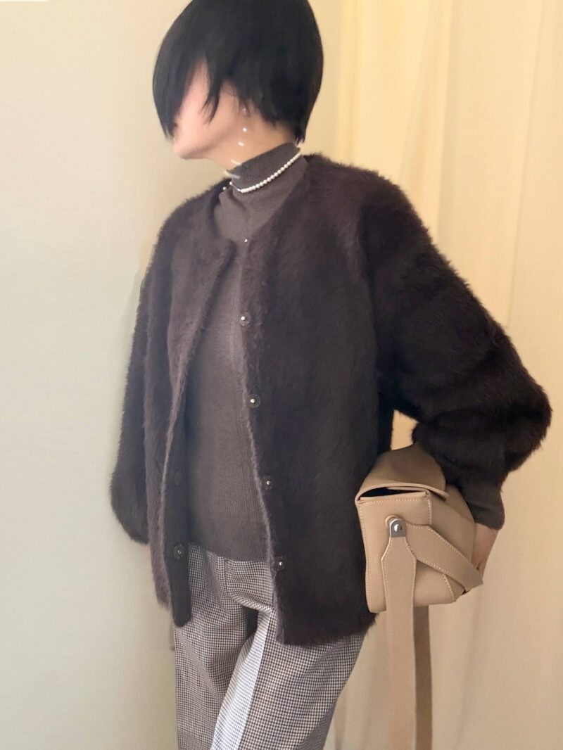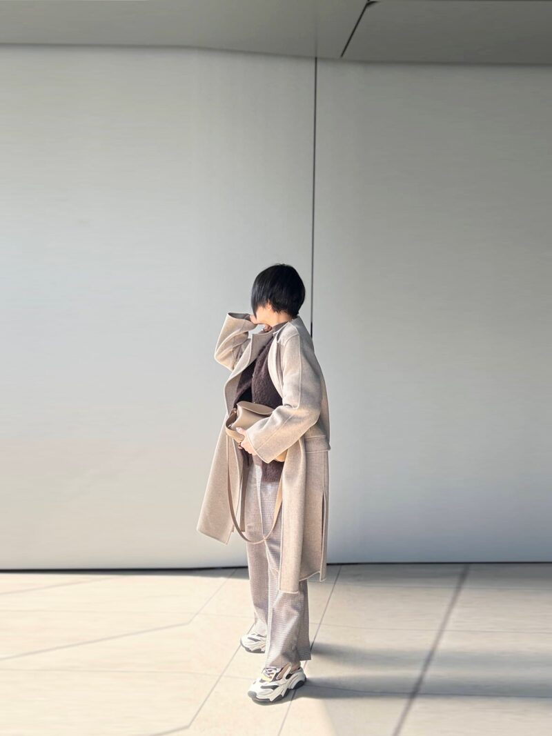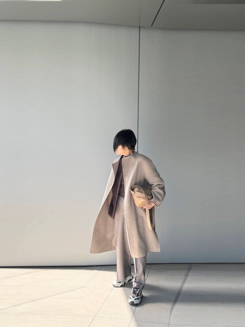 bagは今期、大のお気に入りのZAKKABOXさんの2WAYのベージュで。このバッグ、ベージュの色合いが絶妙で今日のような「チョコパフェ色コーデ」にしっくりなじむ。