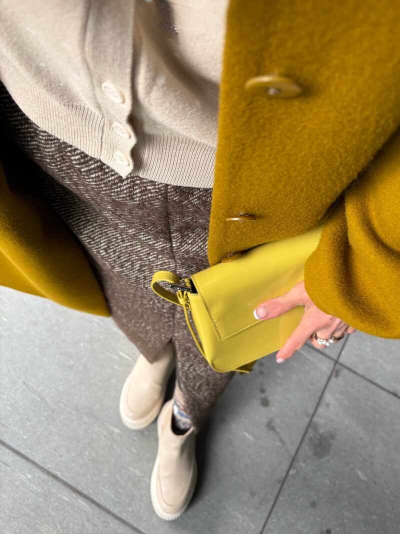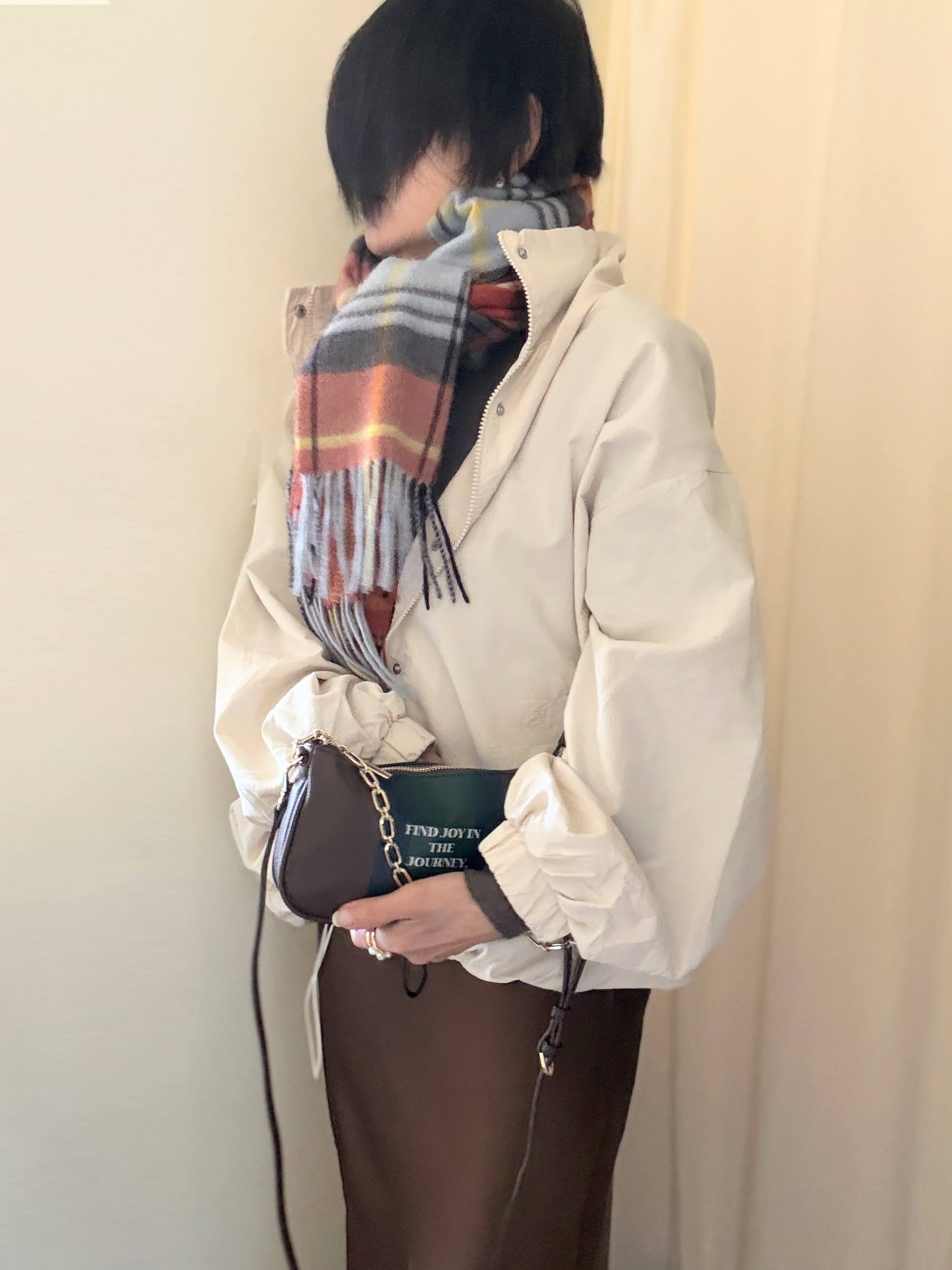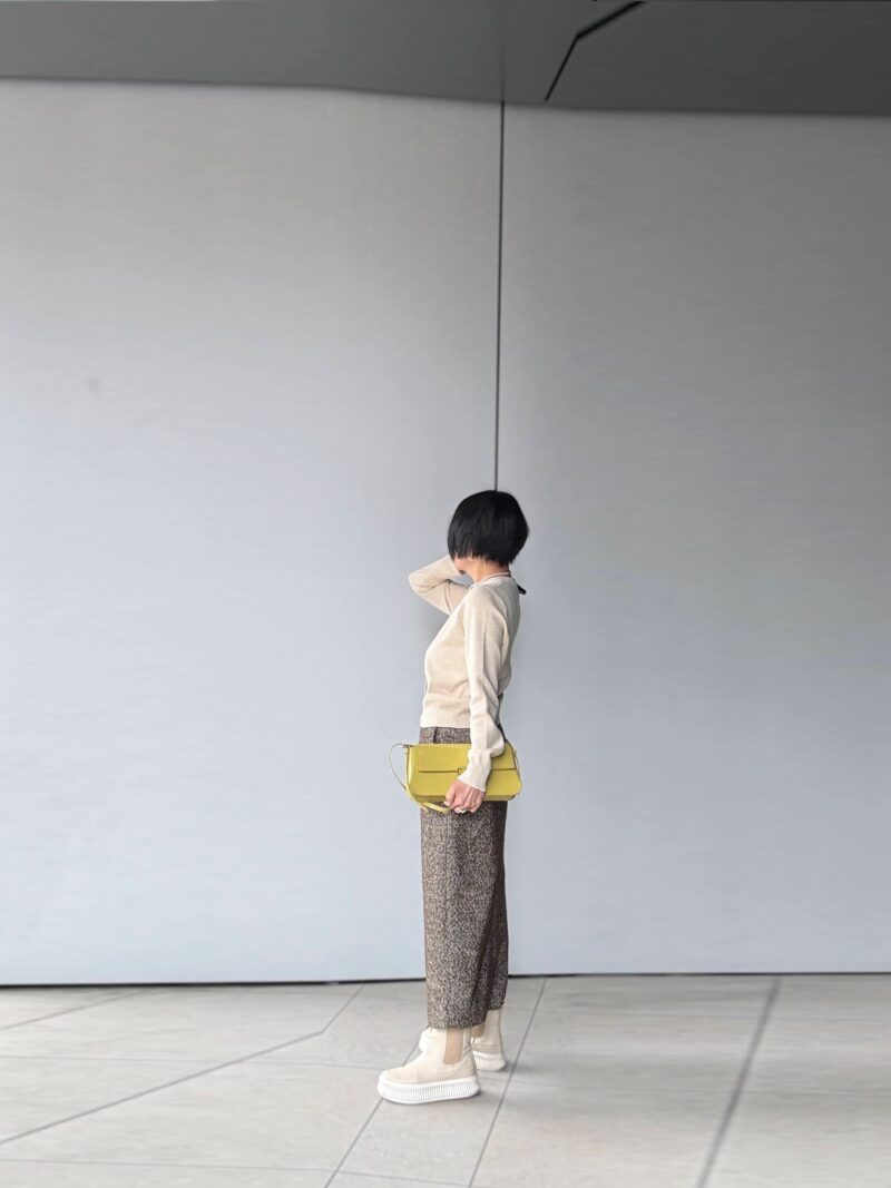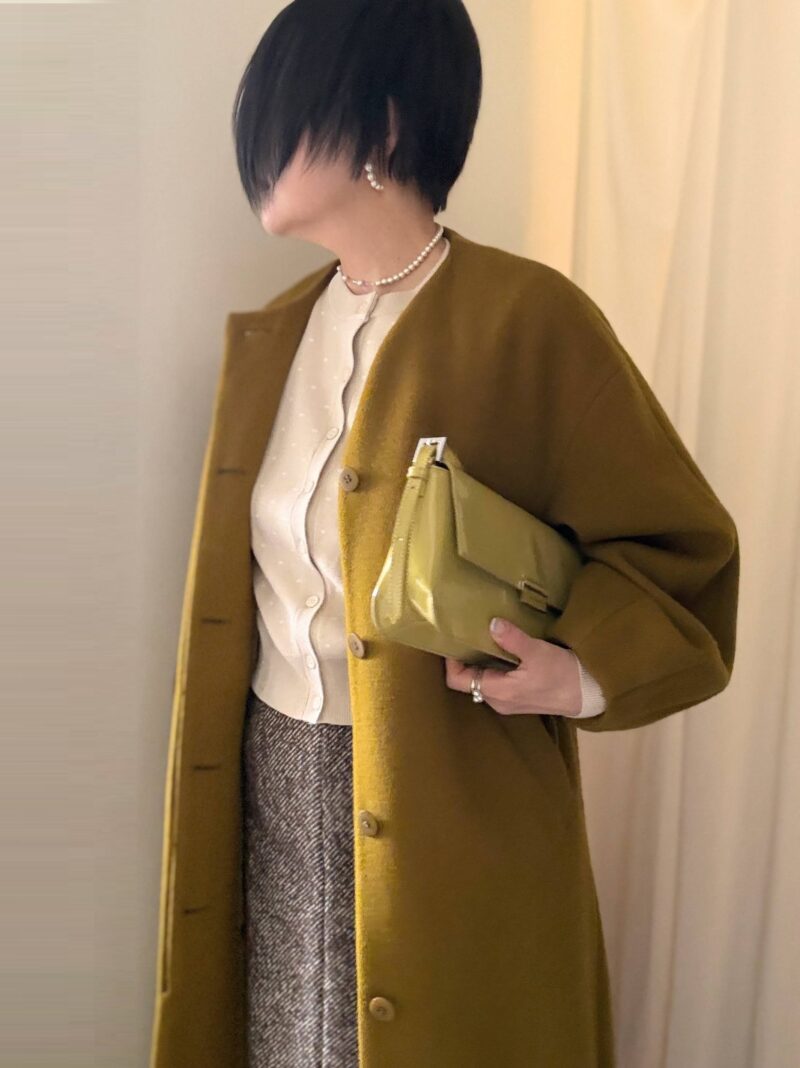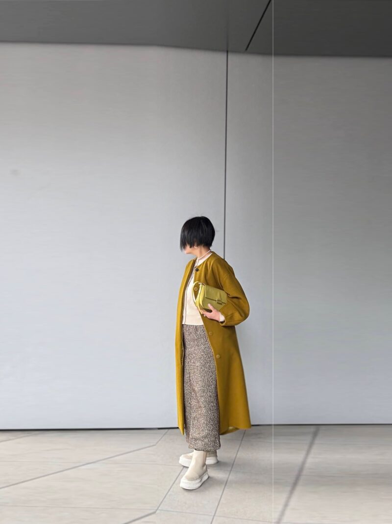 薄地のブルゾンかトレンチにしようと思ったものの、朝はヒヤッとしてたので、これまた諦めて冬のロングコート羽織り。ニットカーディガンと色味があったので辛子色で。