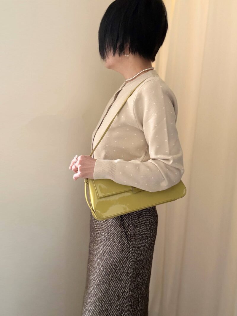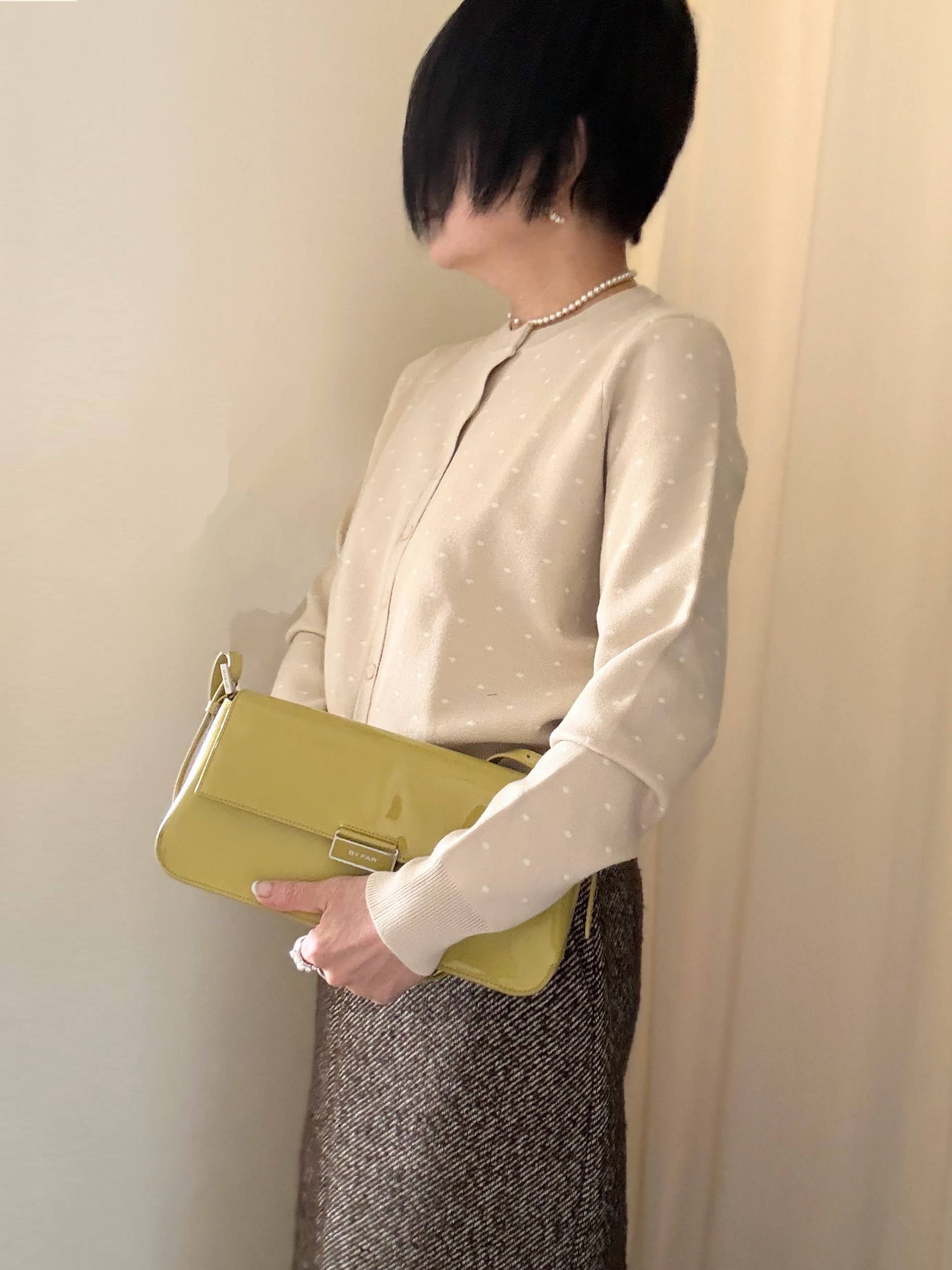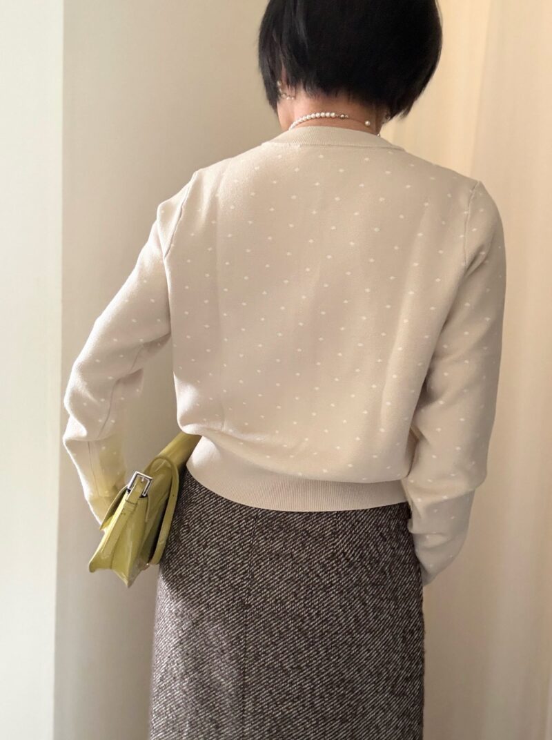 ツイードウールのスカートにタイツ+ブーツで下半身は防寒したものの、上半身だけは軽やかにしたい。ということでこちらのニットカーディガンがぴったり。
