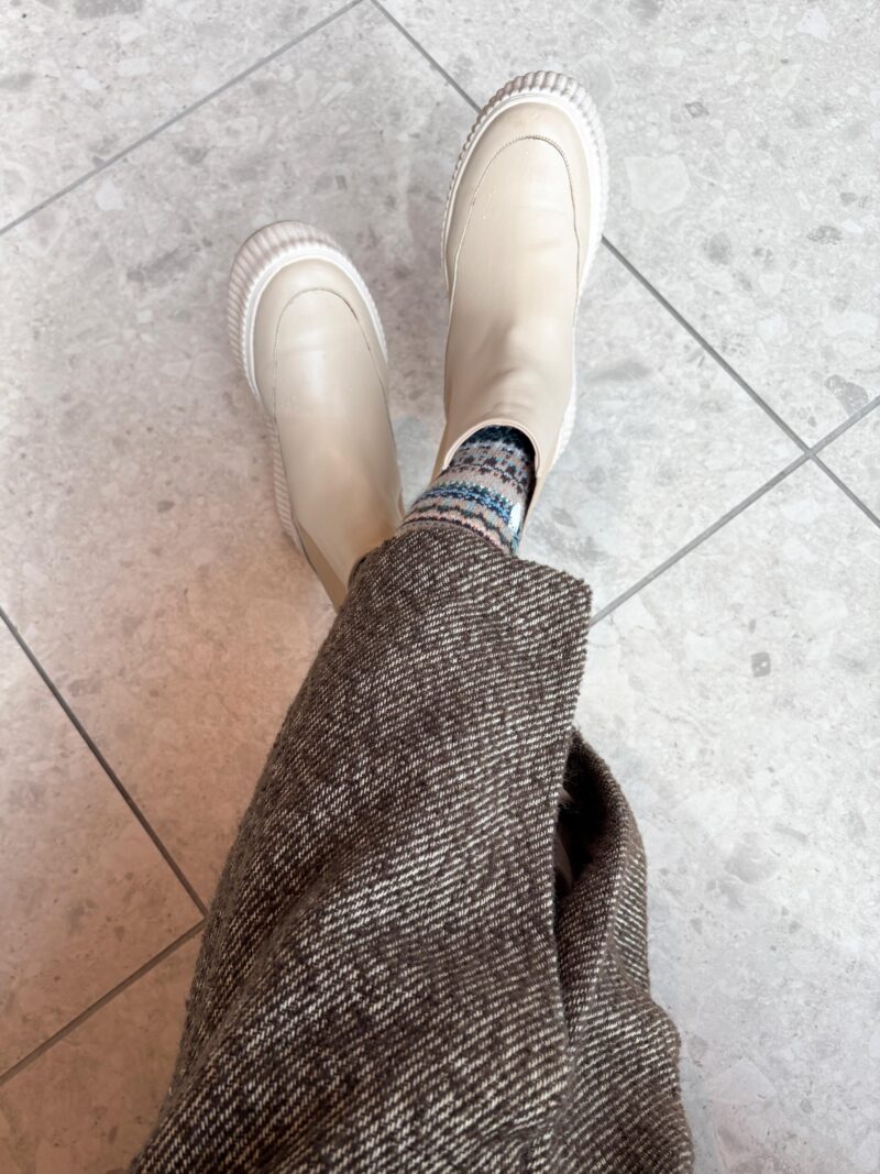この手のぽってりブーツってサイズが大きめに作られているので、タイツだけで履くと足が泳いでしまうので、もう一枚ソックス重ねると安定する。暖かいし。
