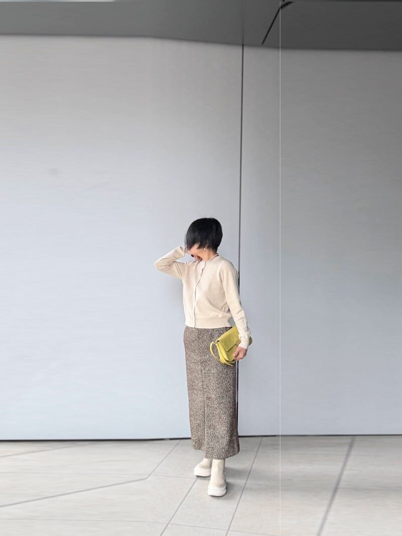丈がコンパクト目なニットカーディガンなので、ロングタイトスカートとバランスよかった。