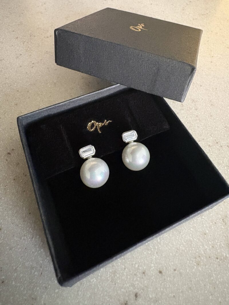 やや大き目のパール+四角いビジューが耳で映えるピアス。