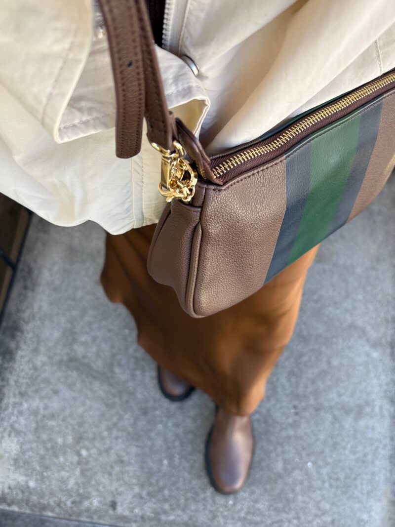 bagは今日も斜め掛け。スカートをこげ茶のサテンマーメイドスカートにしたのでバッグも茶系で。