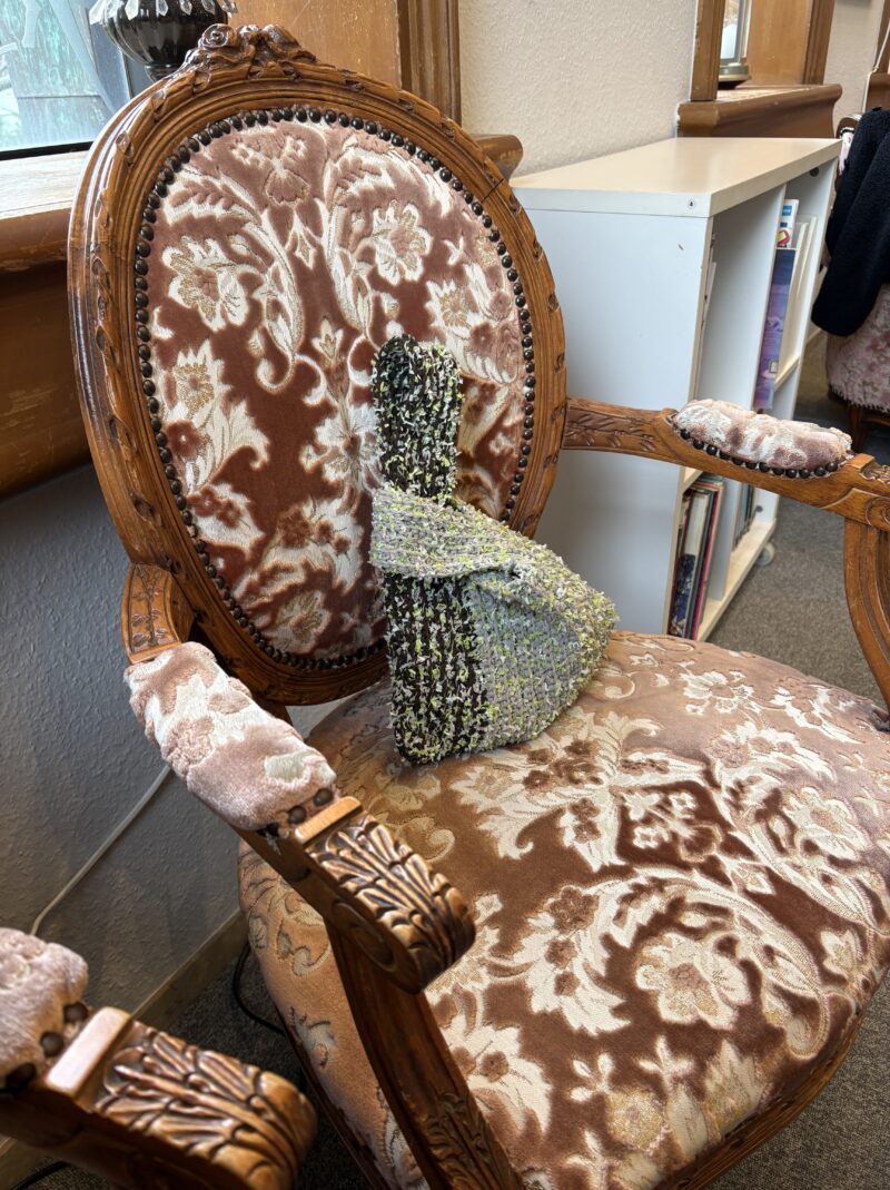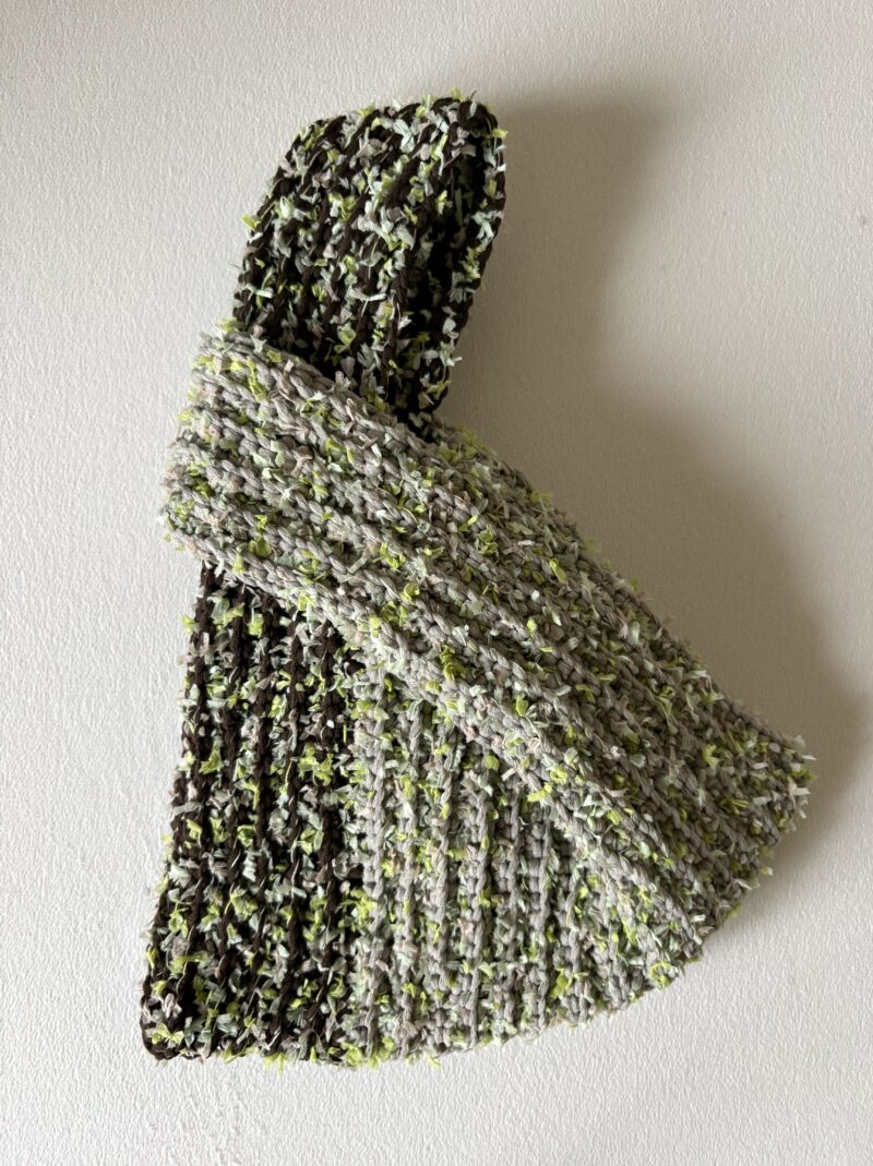 糸がとにかくカワイイ。葉っぱが連なったような細い糸と太目糸の2本引き寄せ。ほぼ細編みだけで真っすぐ編むだけなので簡単だった。あっという間に完成。
