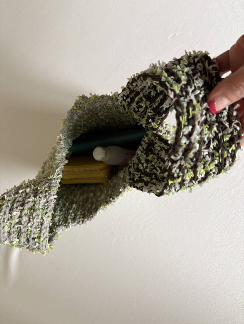 出来上がってみて驚いたんだけど、こんなに小さいミニbagなのに、糸が伸縮性があるせいでなんでも入る。結構な容量。スマホもモバイルバッテリーも全部入った。