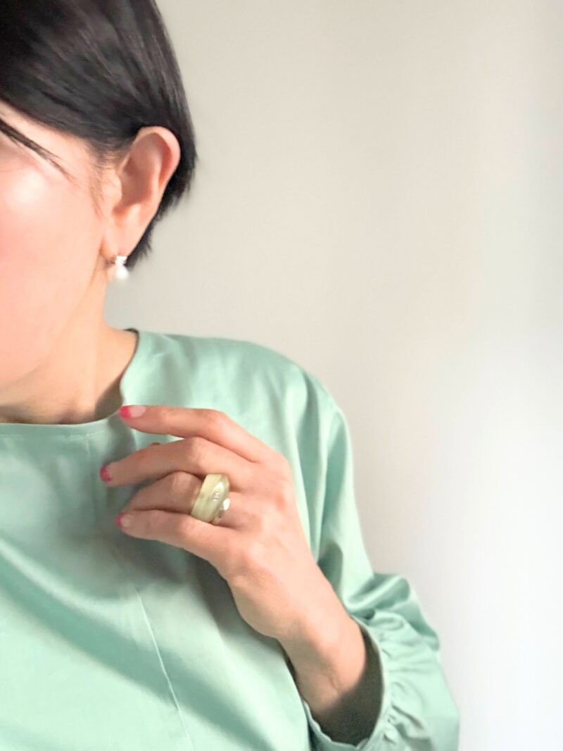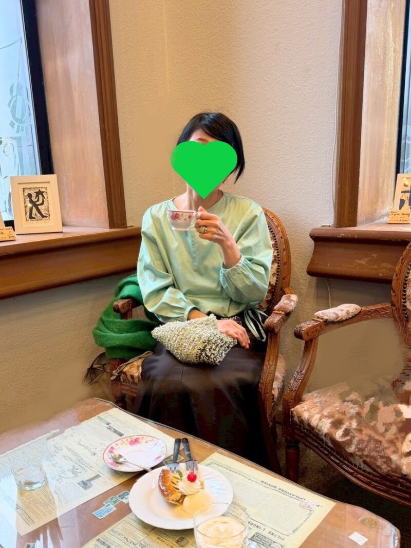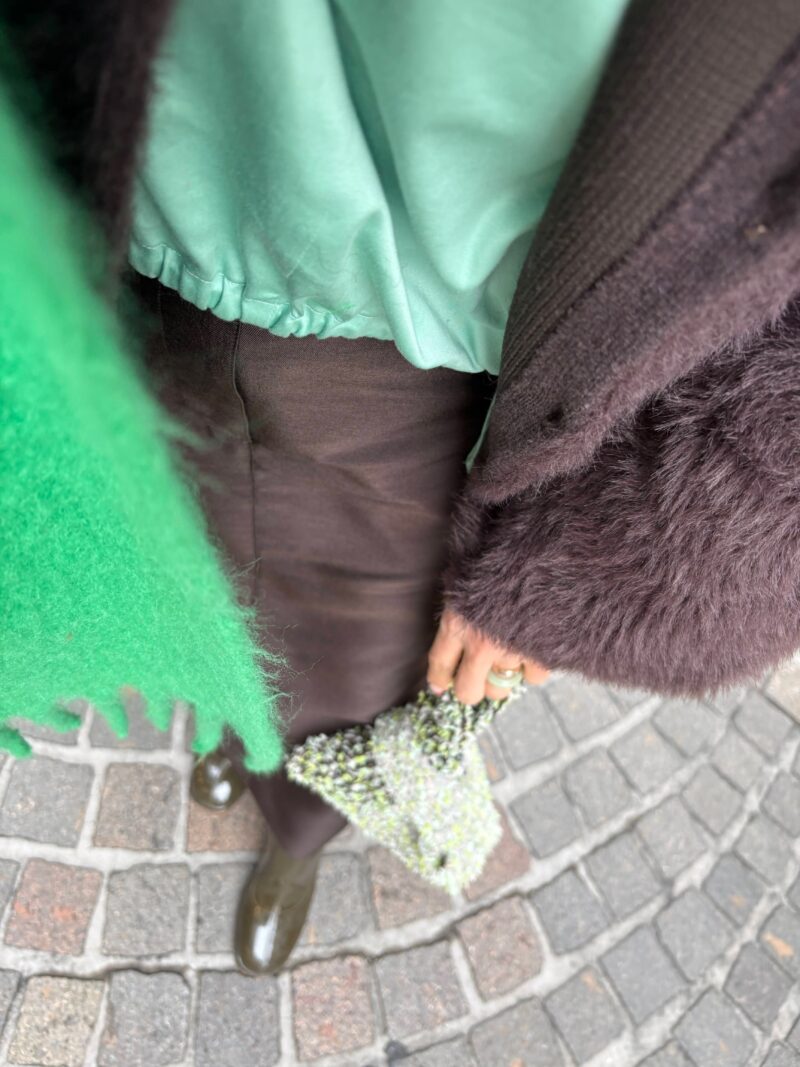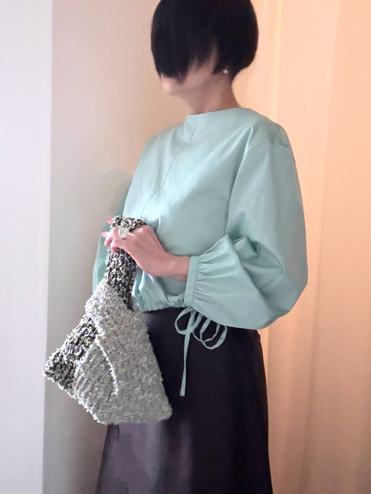 今日はとことんこのニットバッグに色リンク。グリーンのブラウスにこげ茶のスカートで。