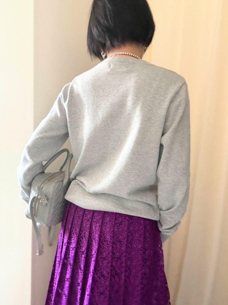 鮮やかな紫(というか鮮やかピンク)のレースのプリーツスカート。「こんなの何処着ていくのよ」シリーズだが、今日はこのスカートをグレー合わせでコーデしてみた。ちなみに過去コーデ。