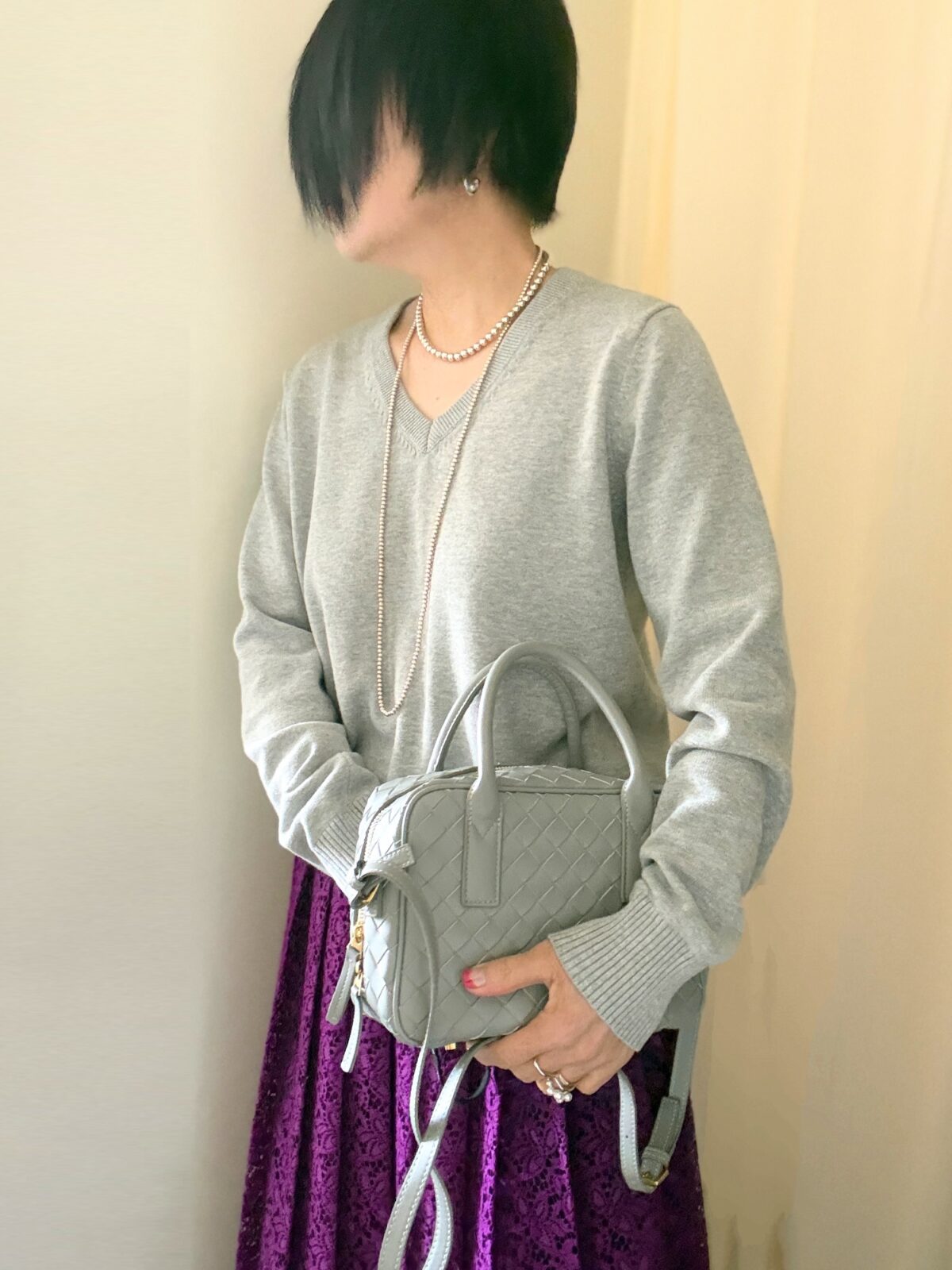 スカート以外のアイテムをすべてグレーにしたので、全体が柔らかい感じになったかと。