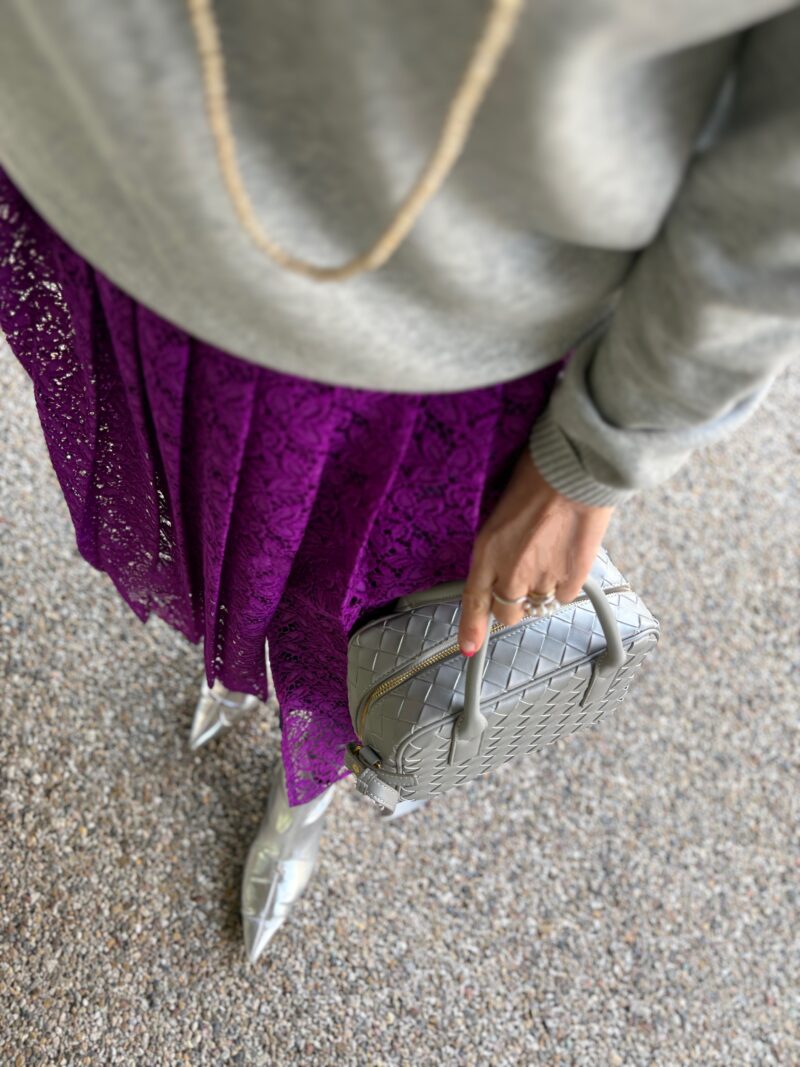 紫のレース生地のプリーツスカート。楽しい。