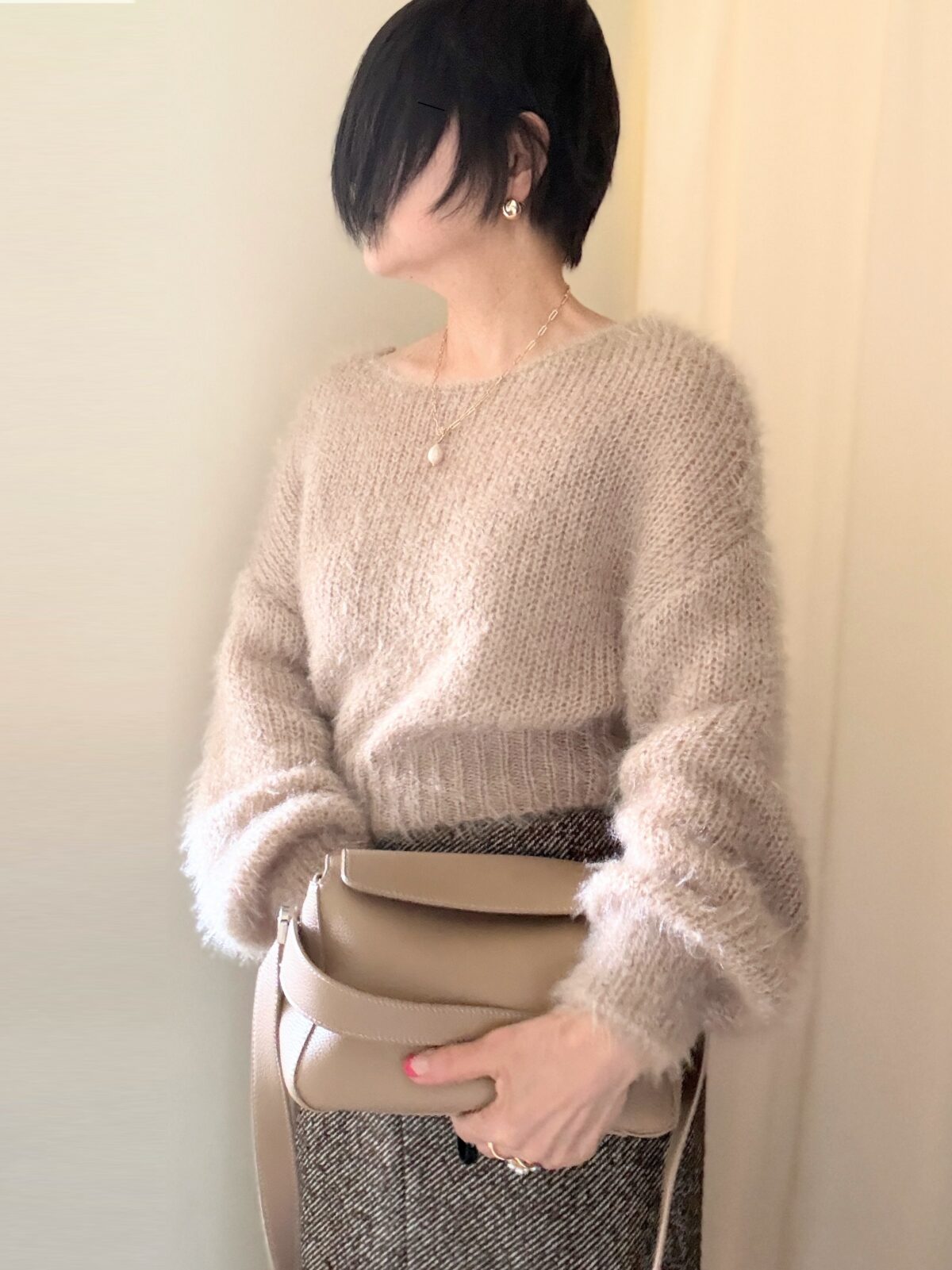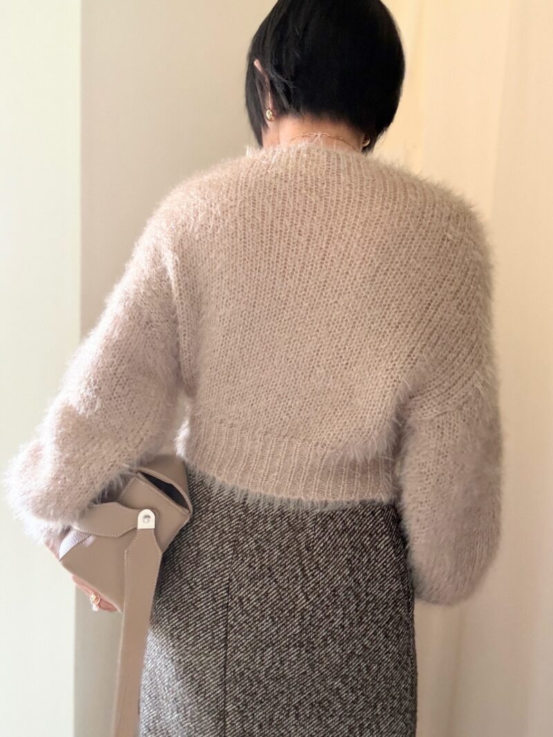もこもこニットにツイードの分厚いスカートで。