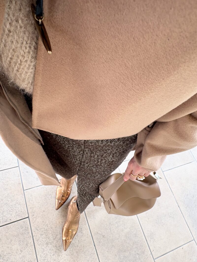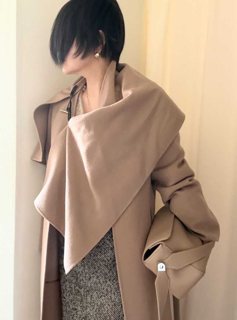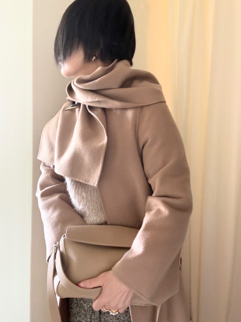 bagもベージュで。このヒラっと体に羽織る感じの軽めのコートが今の気分にマッチ。