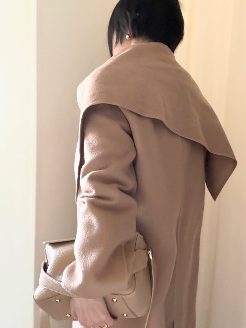柔らかいダブルフェイスの生地で裏地無しなのだが、薄地でかつ、ボタンもなく前が閉じれない。。。。しくじった~と一瞬思ったのだが、いや、逆に着てみたら✅軽い✅サクッと羽織れる✅肩凝らない!ので、この時期にぴったりなコートだった。着てみて即お気に入りコートになった。