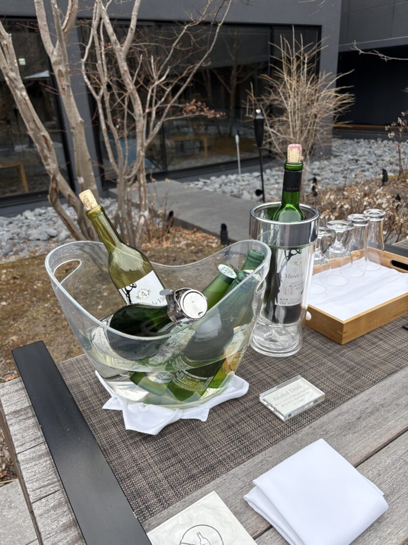 中庭では夕食までの時間、お酒や地元のリンゴジュースなどがフリーフロー!