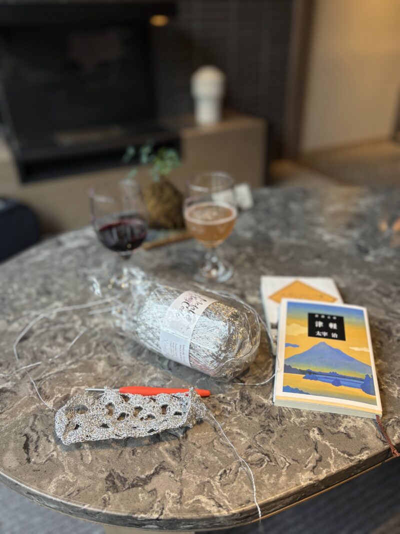 今回、静かな宿を満喫するため、できるだけスマホやTVを見ないで過ごそうと思って。デジタルデトックス。文庫本と編み物を持ってきた。