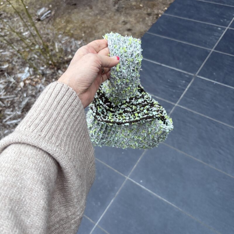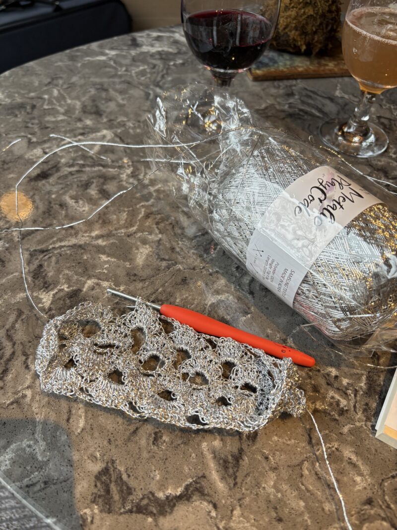 細いメタリックな糸を輪にする編み方で模様編み。なんでこんな難易度の高いものを始めてしまったのか・・・がんばるしかない!
