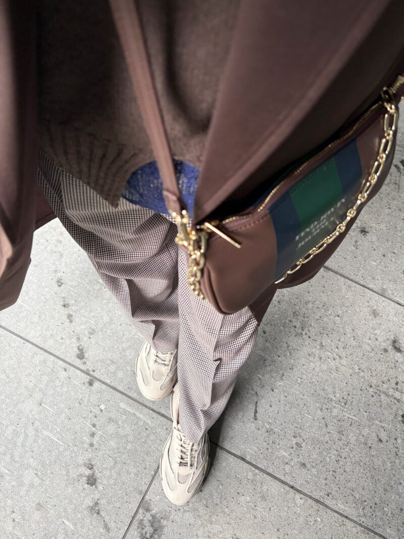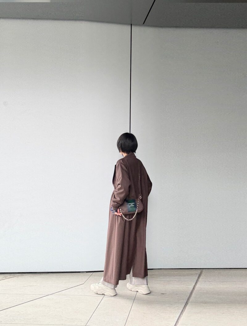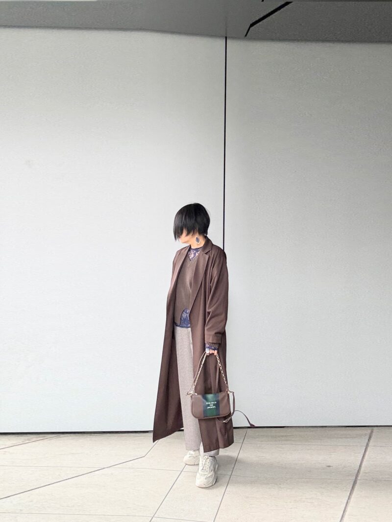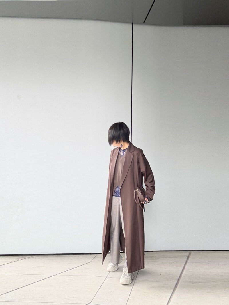 茶色の薄地のコート羽織った。ベルト付いてる薄いコートなんだけど、ワイドパンツだし「羽織る」感じの方がサマになるのでこのままで流す。