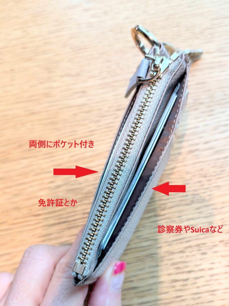 ファスナーポケットの両側にOPENポケット付いているのでカード類・診察券など入れられる。