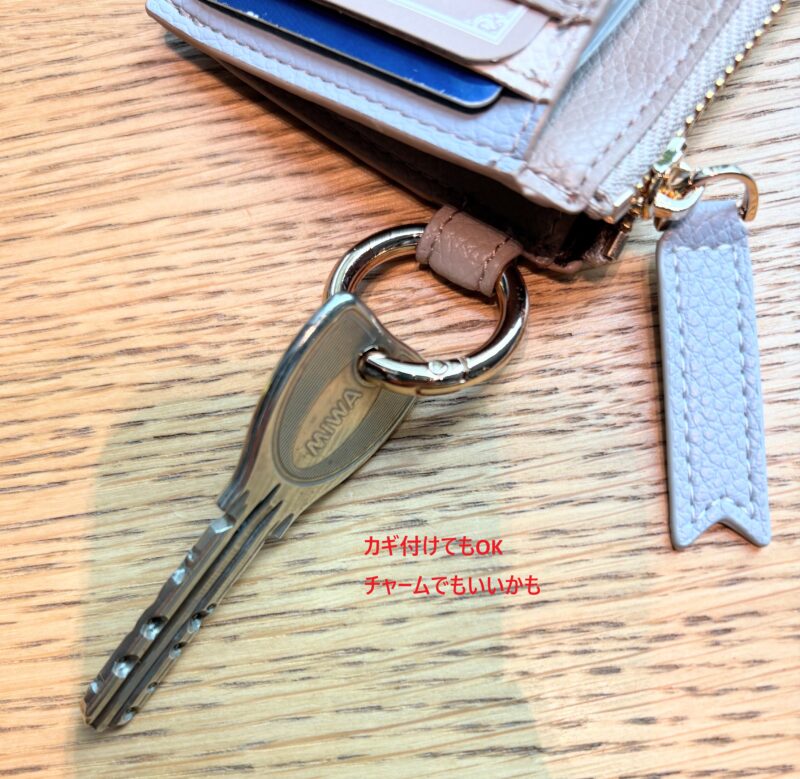 さらにカラビナ付きで鍵も付けられる。可愛いチャームなど付けてもいいかも。