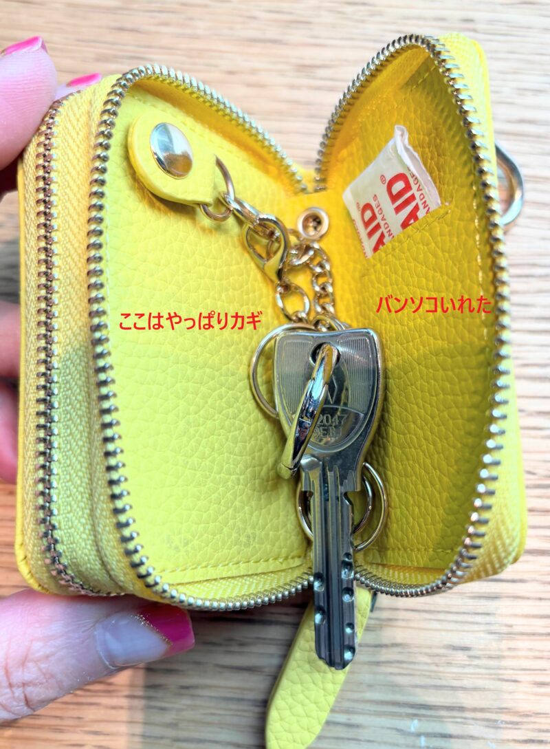 カギはやっぱりこっちの黄色い方に付けた方が良さげかな? カギそのものを収納できるのでバッグの内部で裏地を傷つけない。中に緊急時の絆創膏入れちゃった。(靴擦れって突然襲ってきますからね)頭痛持ちの方とか痛み止めの薬を入れておくと安心でいいかも。