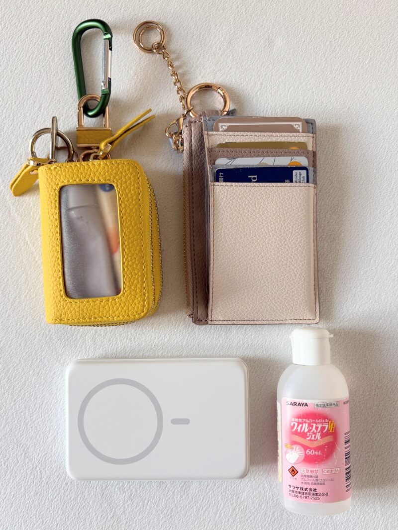 このフラグメントケースとキーケースに+モバイルバッテリー(マグセーフ充電で無線。コード不要)だけ入れて一日事足りた。(スマホはストラップでボディ掛け)