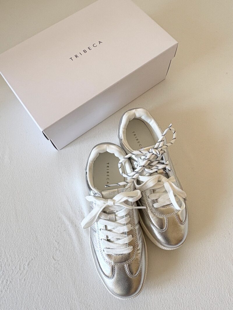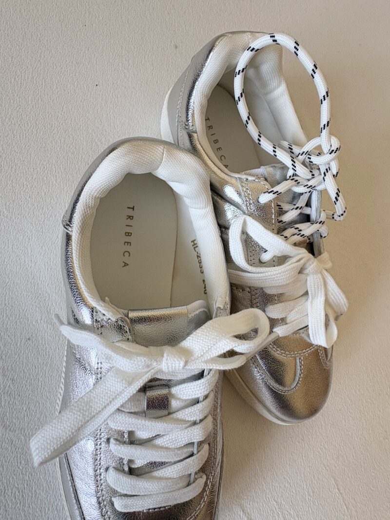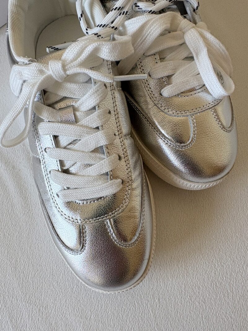 足元の色も悩み。白いスニーカーにするつもりだったけど、ちょうど届いたのでシルバーのおNEWのスニーカーを。