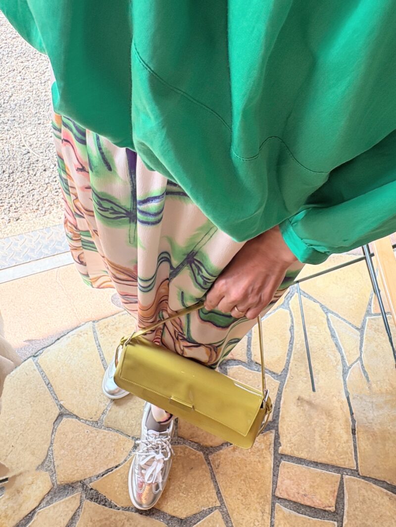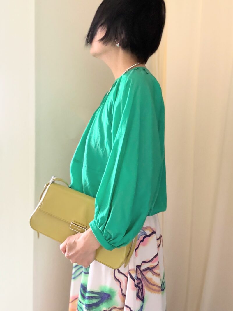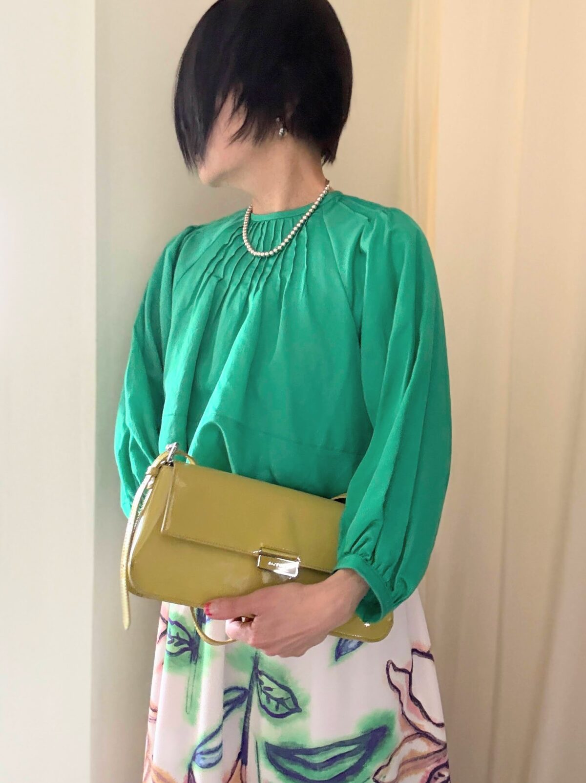 春らしいキレイ色が集まったロングスカートから1色取って鮮やかなグリーンのブラウスをTOPSに。色リンク。