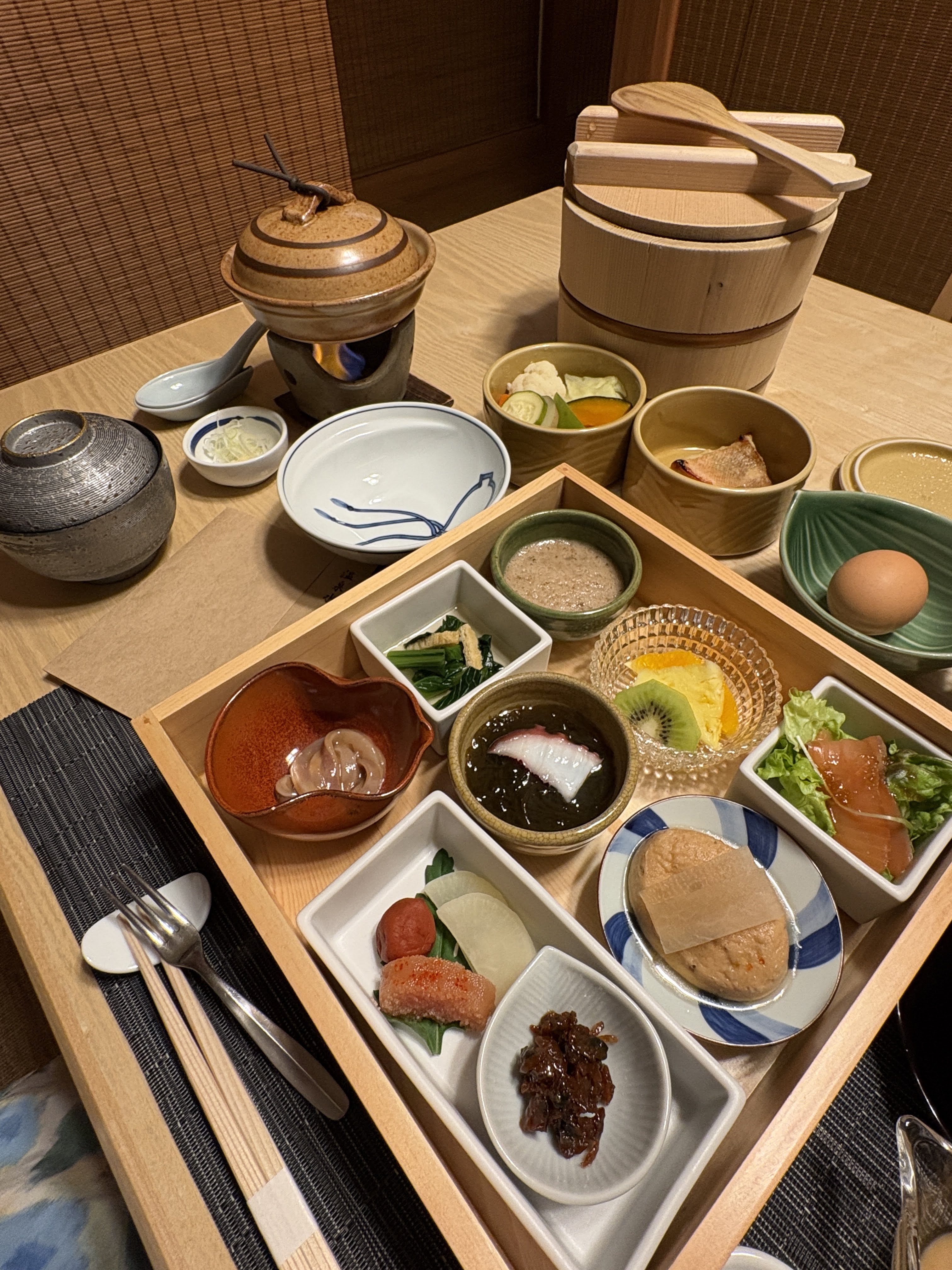 朝食。温泉水で蒸したお野菜など優しいお味だった。
