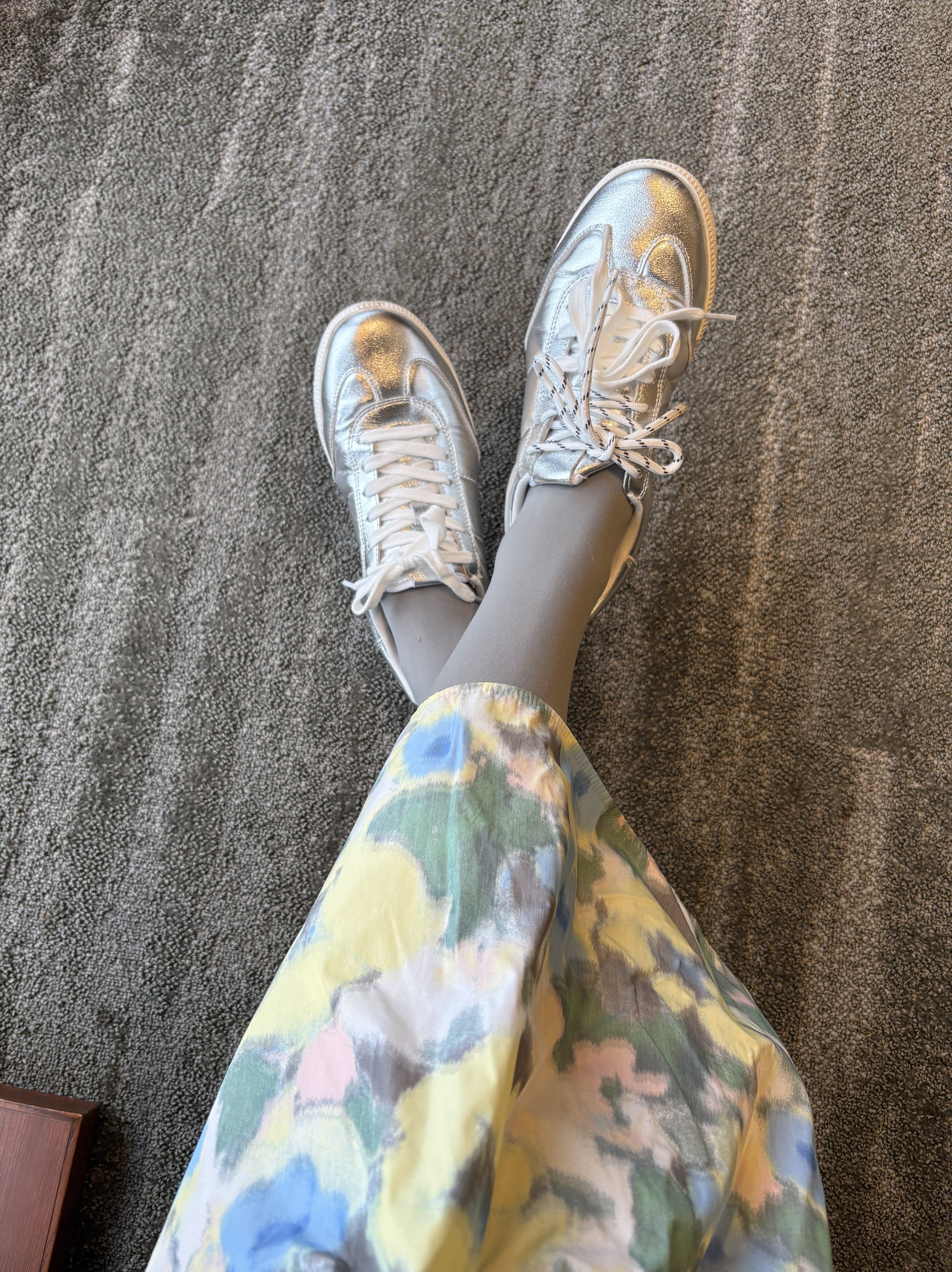 足元はどんな色にも必ず合うシルバーのスニーカーで。活躍しすぎぃ。グレーのタイツ。
