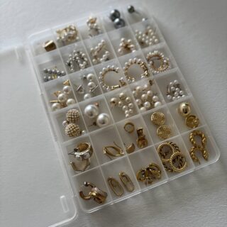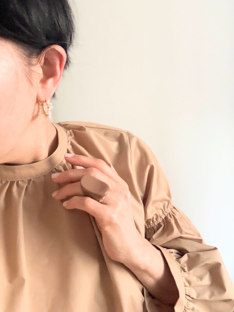アクセサリー。ネックレスをしたくなるのだが、ここはグッとこらえる。こういうブラウスって胸元のシンプルさをそのまま生かしたい。