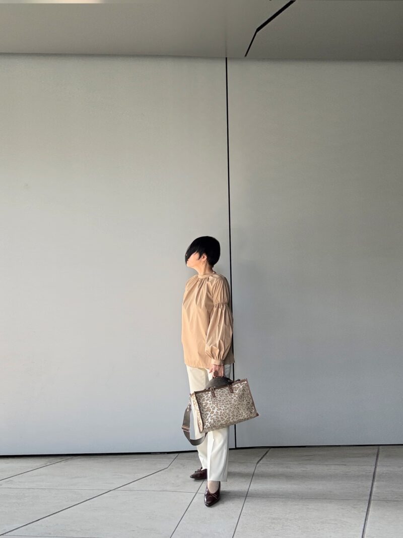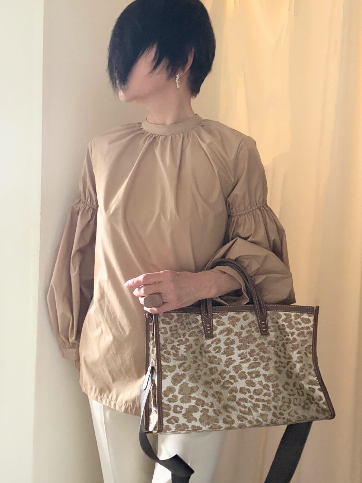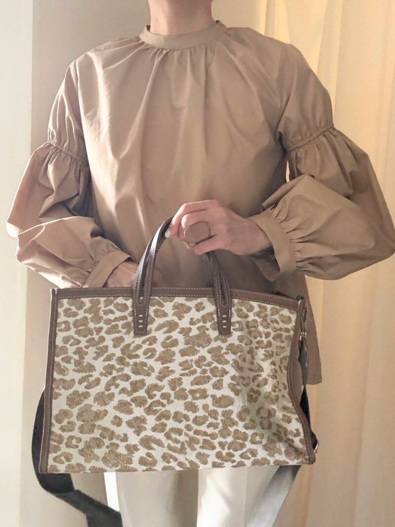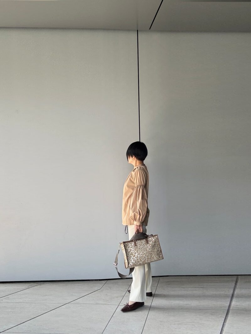 ベージュ×アイボリー×こげ茶、バッグも色リンクでベージュ系のパンサー柄。