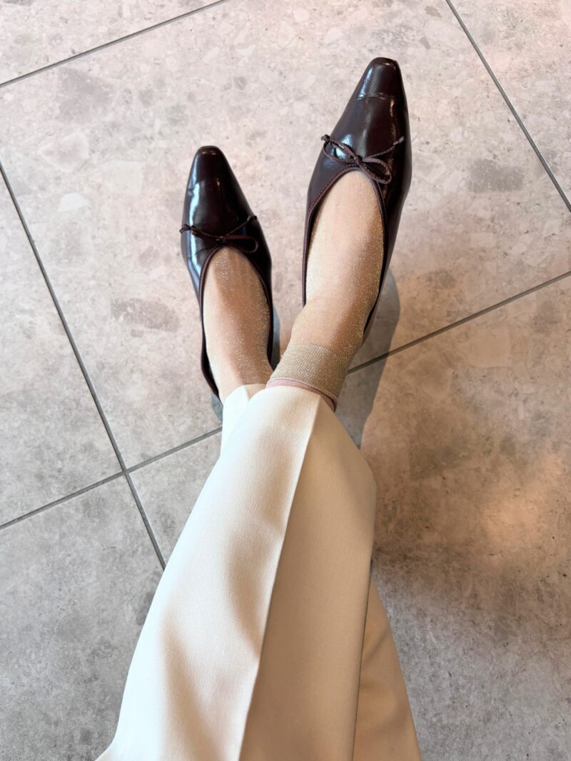 フフフ(*’▽’) 今日履いてるのは「シアーラメソックス」。意地でもナチュラルストッキングを履きたくない私が編み出したハック。普通の透けない靴下だとイマイチだな?と思うパンツ+フラットシューズのコーデの時に重宝。すべすべして快適だし、肌触りもよし。ストッキングのあの締め付け感閉塞感もない。デンセンしないし。ラメ感が華やか。