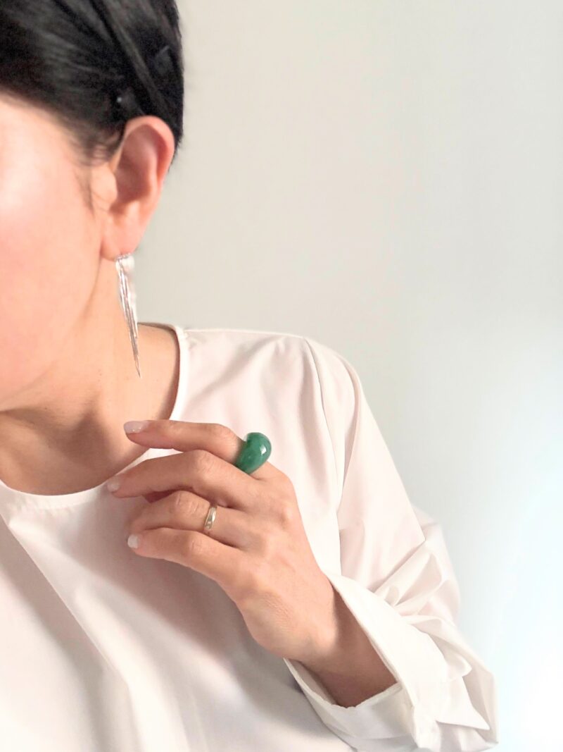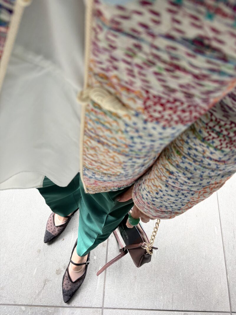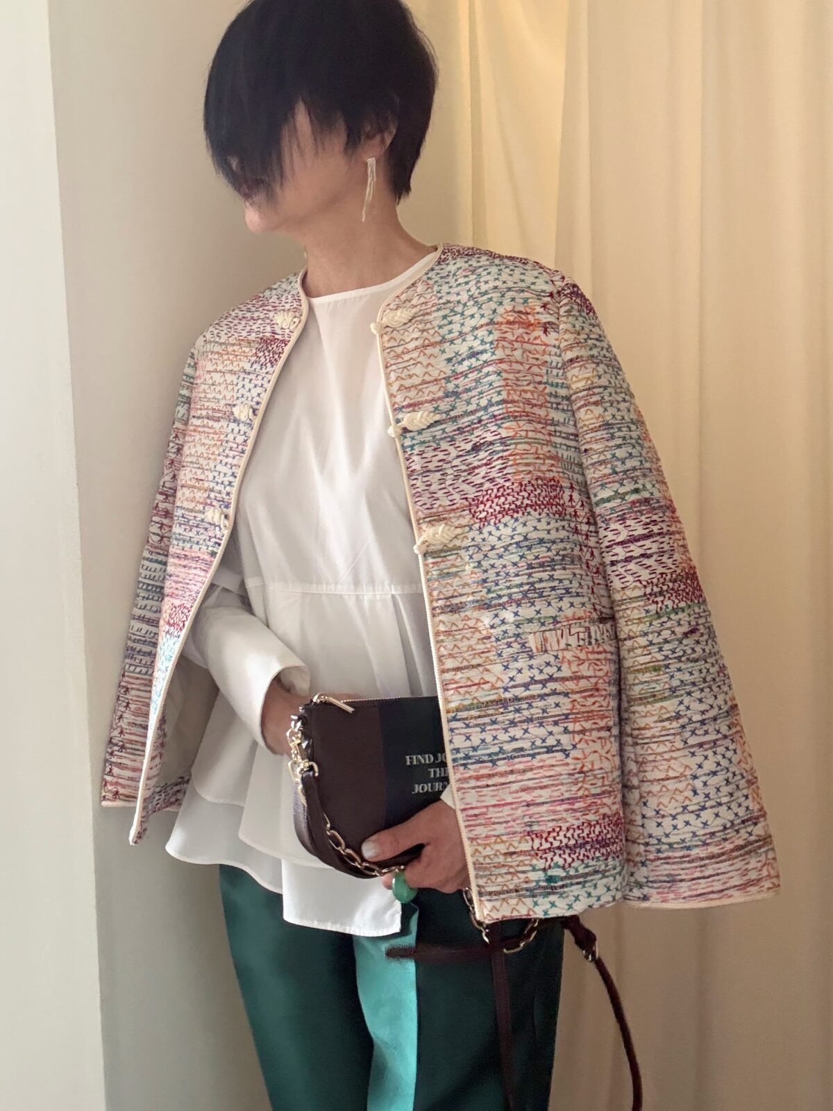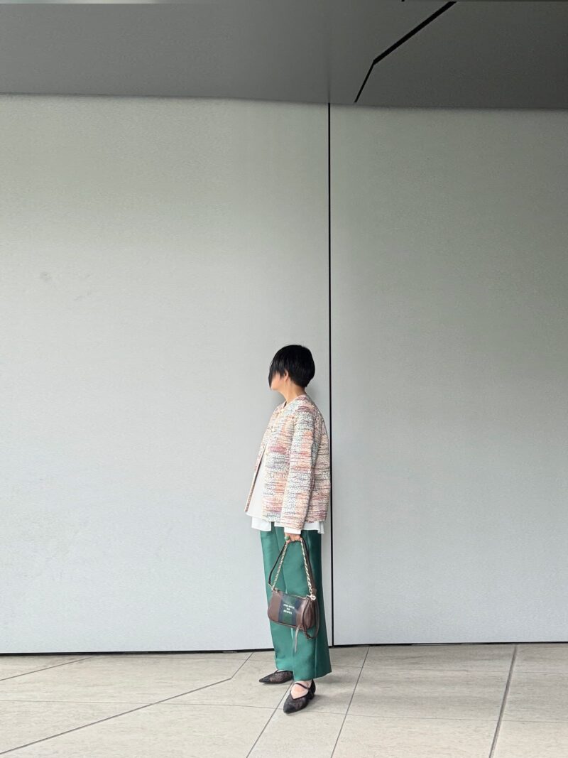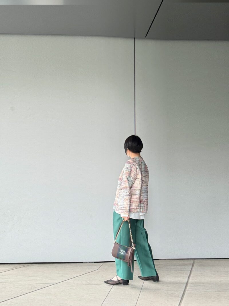 IENAの色々な色が混じっているいジャケット、色リンクコーデのしがいがある。クローゼットを見渡し、まだ合わせていなかった緑鮮やかなパンツを発見!これもこのジャケットに合わせられるんでは?