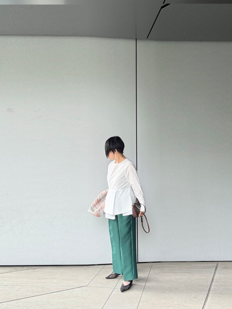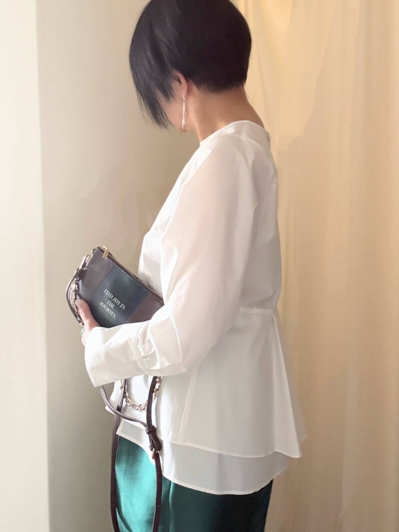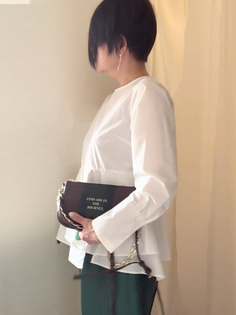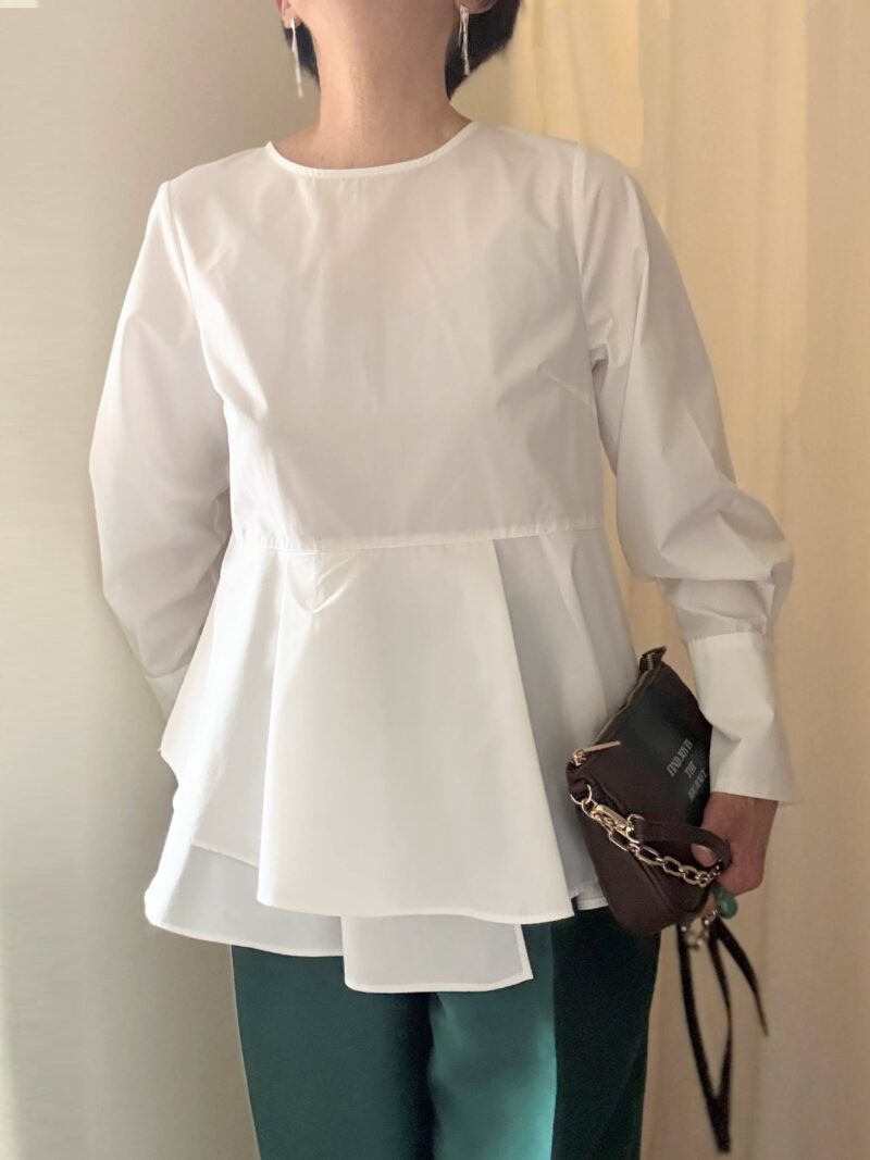 ジャケットの下はこうなると「白」TOPS一択。白トップスの中でも表側(胸側)がシンプルになるこちらのぺブラムブラウスをチョイス。このIENAのジャケットを生かすためには前身ごろにゴチャゴチャ装飾がないインナーがベスト。