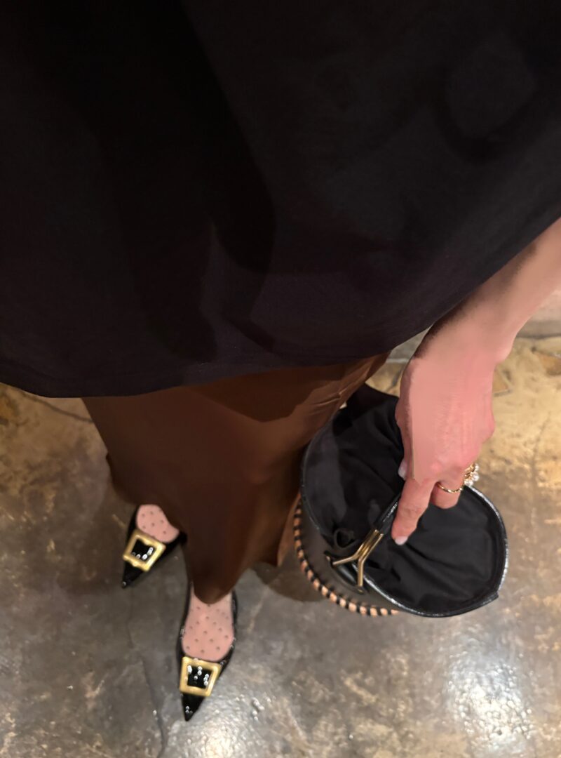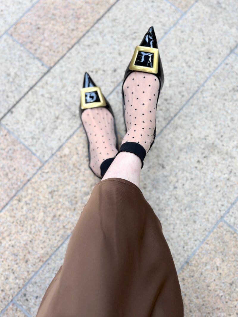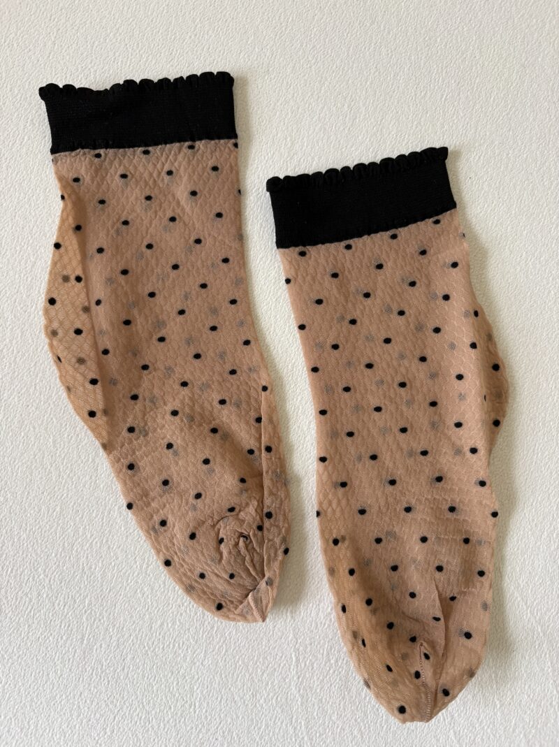 足元。本日のコーデの隠れ主役はこのシアーな水玉ソックス。
