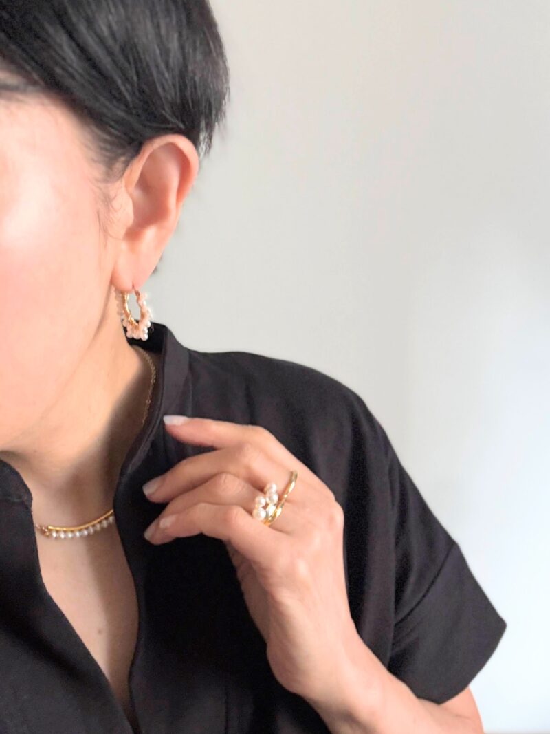 このネックレスに合わせてピアスも小さいパールが連なるフープで。指輪も同様のダブルフィンガー。