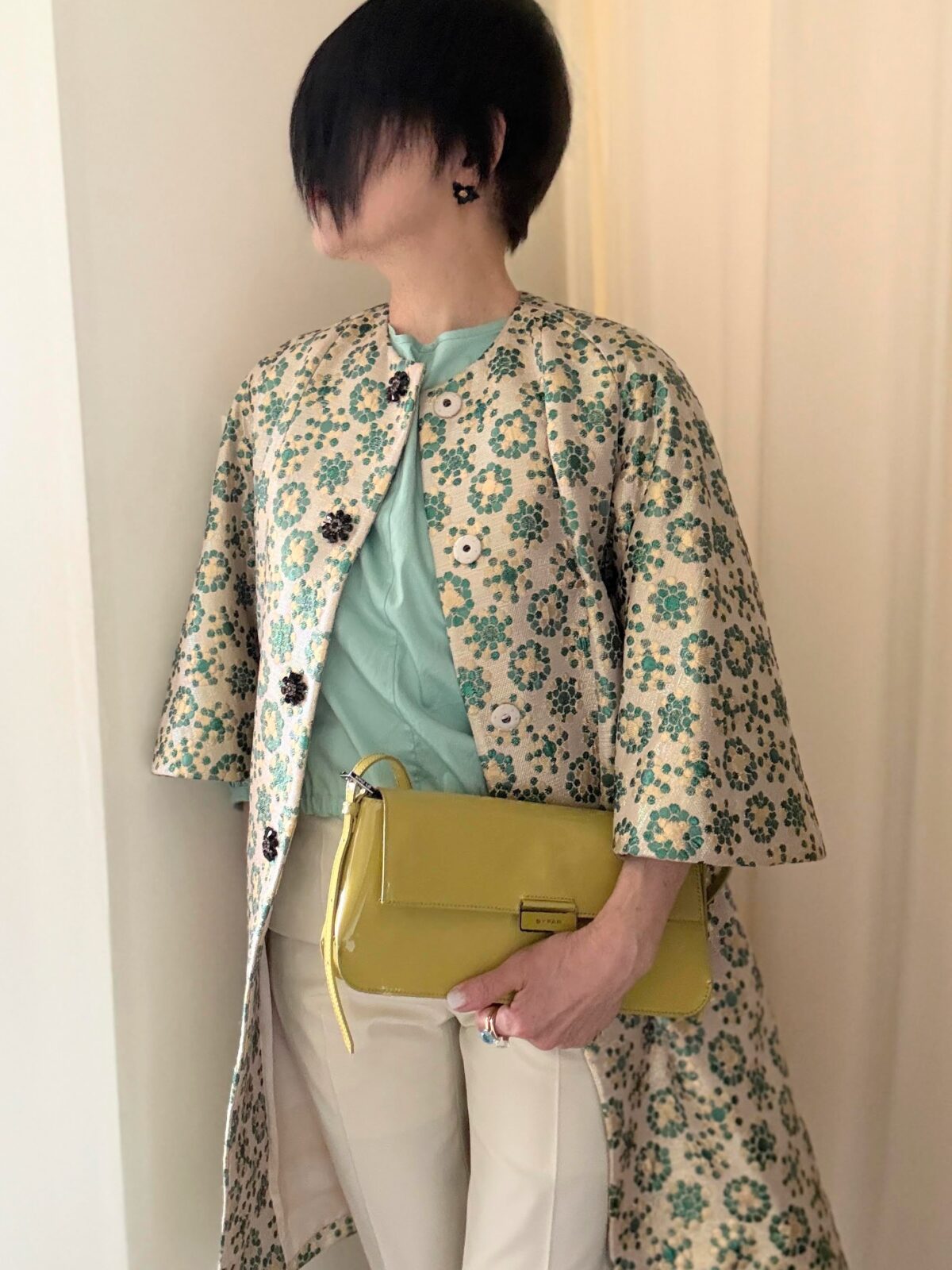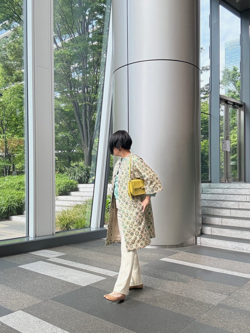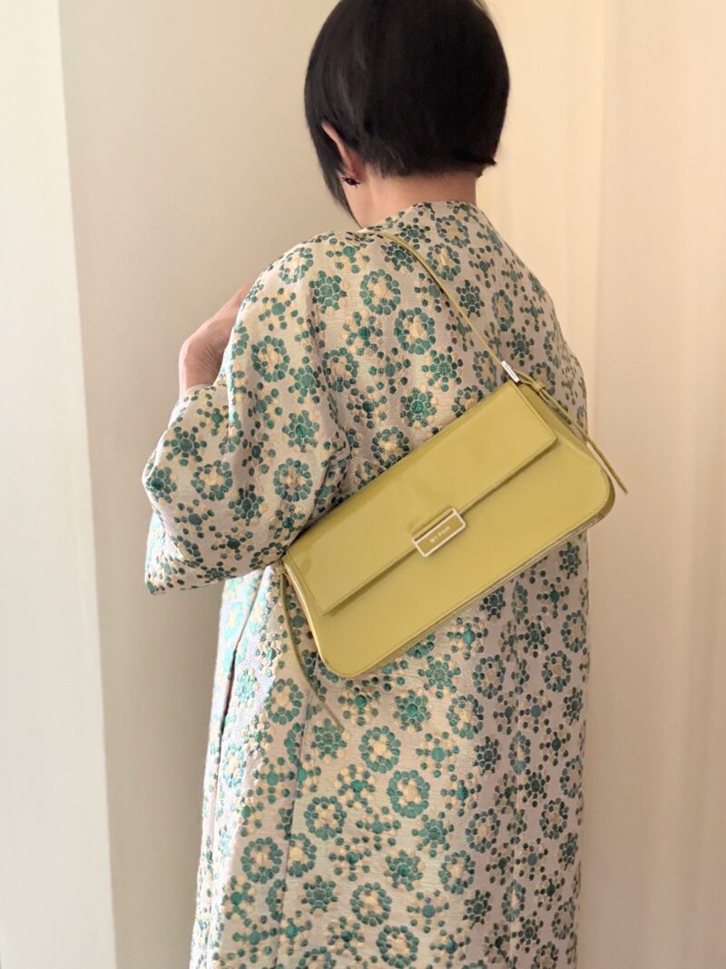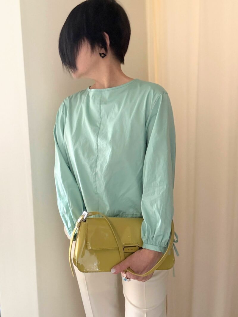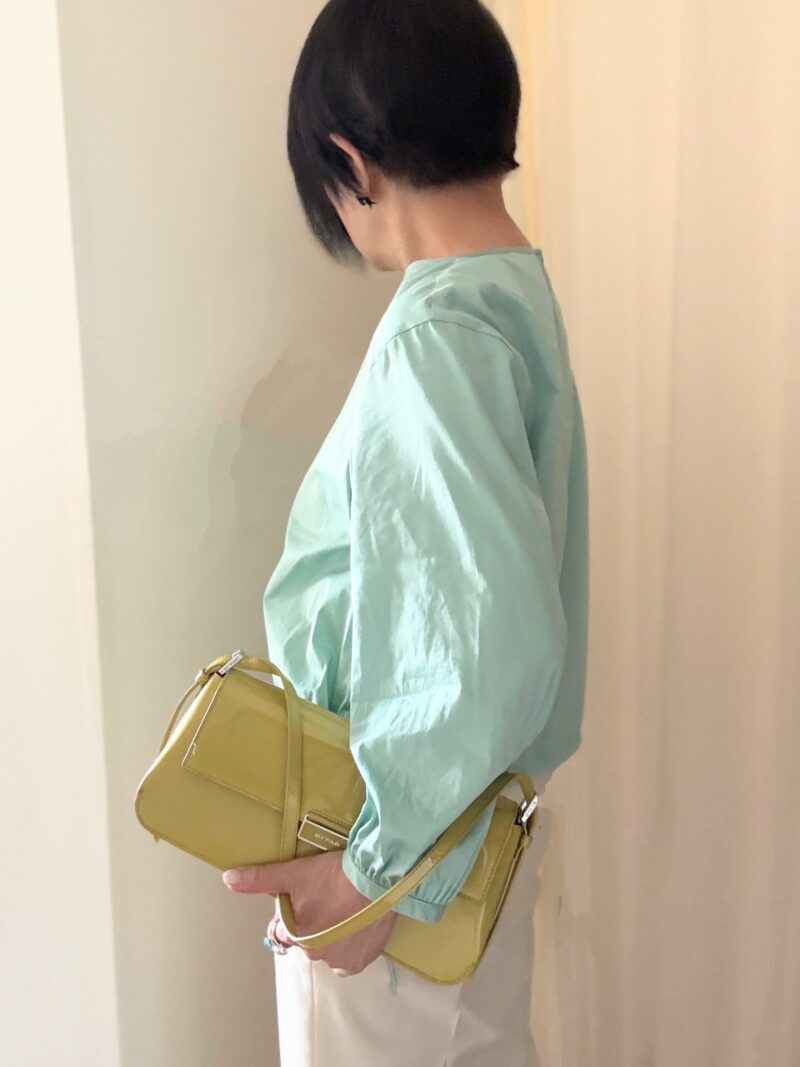 「バッグは白かベージュしか合わせられないな・・・」と思っていたけど、手持ちのこのパテント黄緑色のバッグが色がドンピシャ合った。