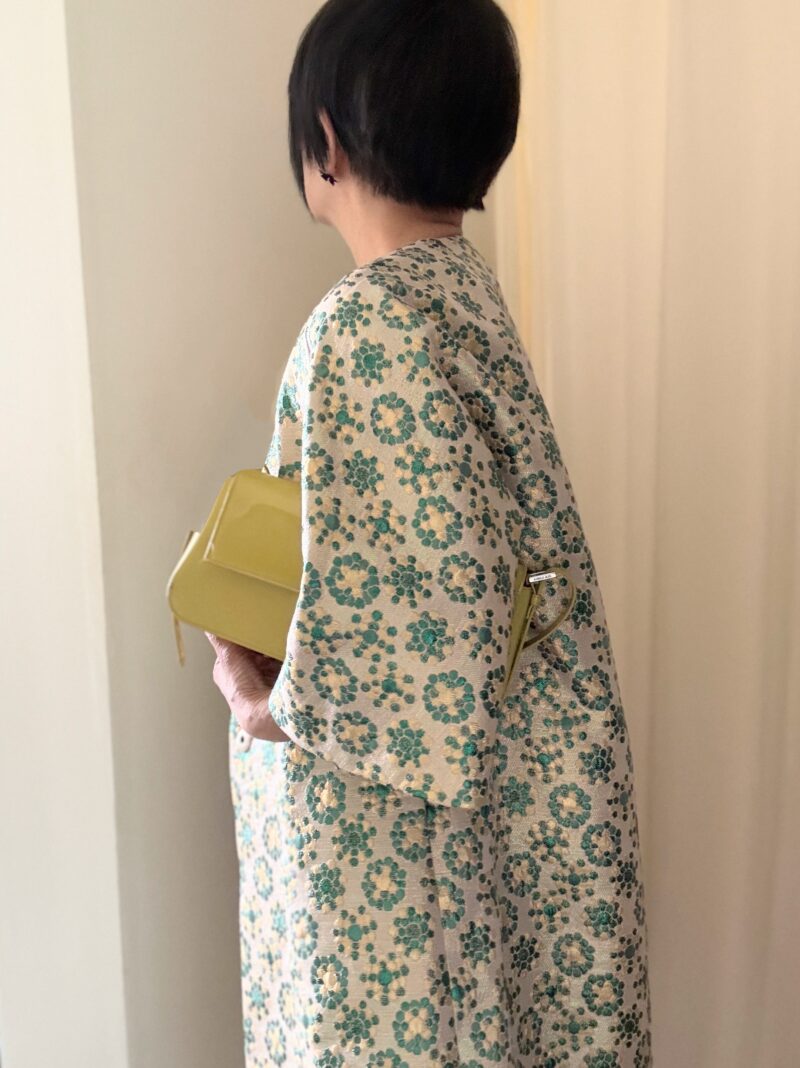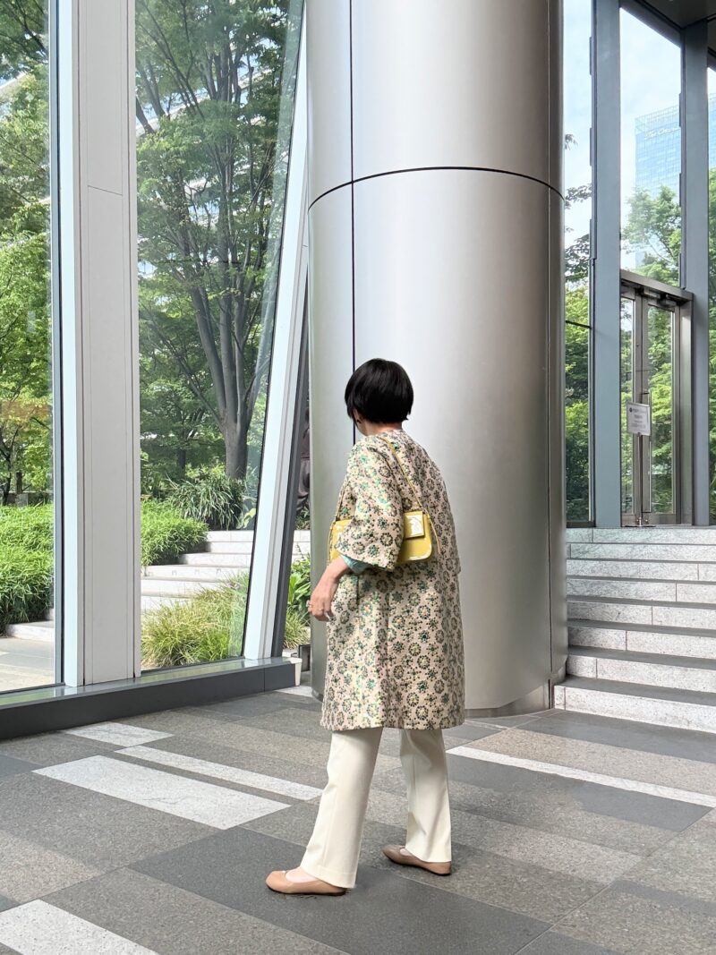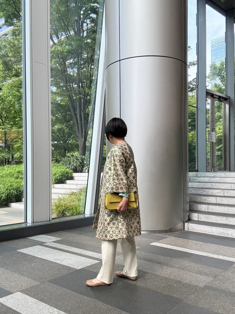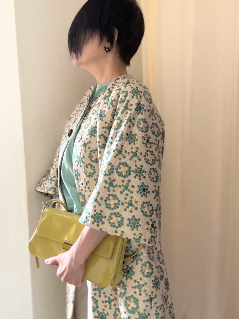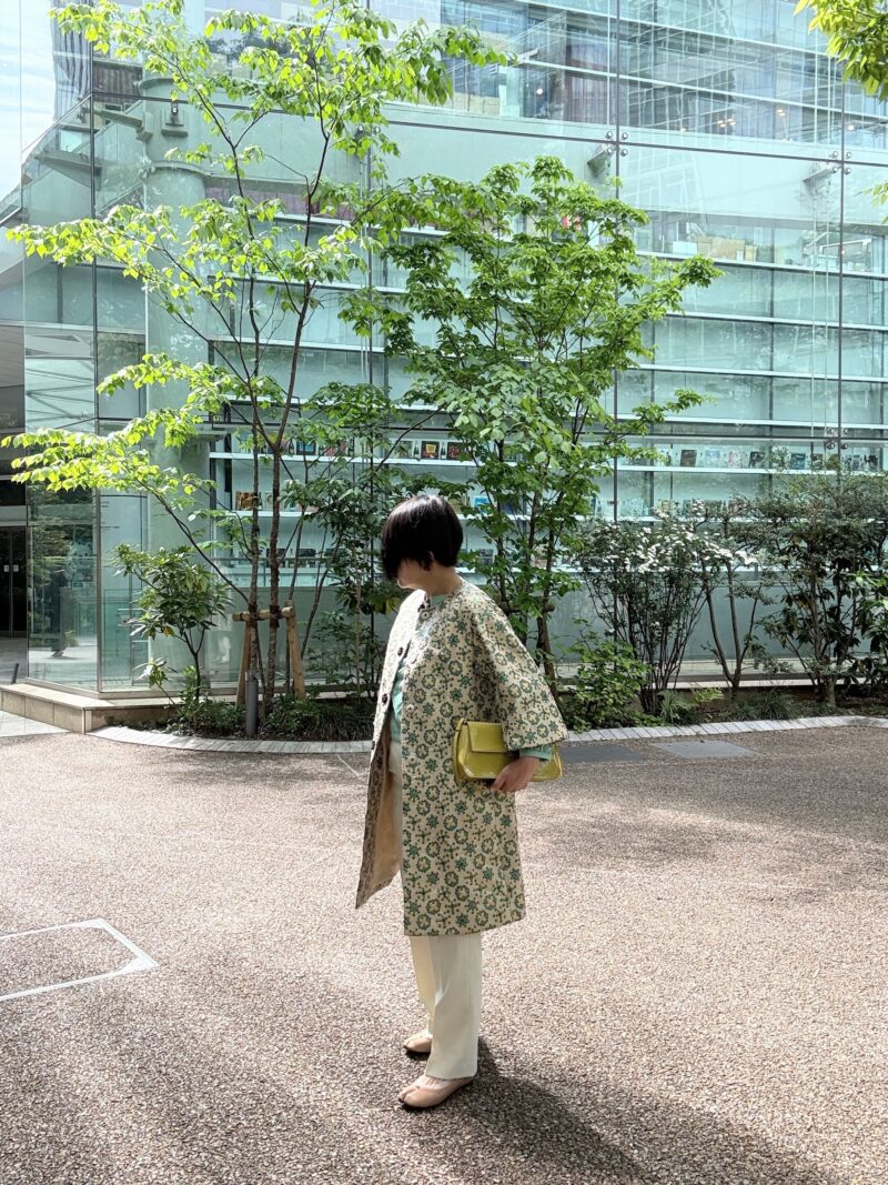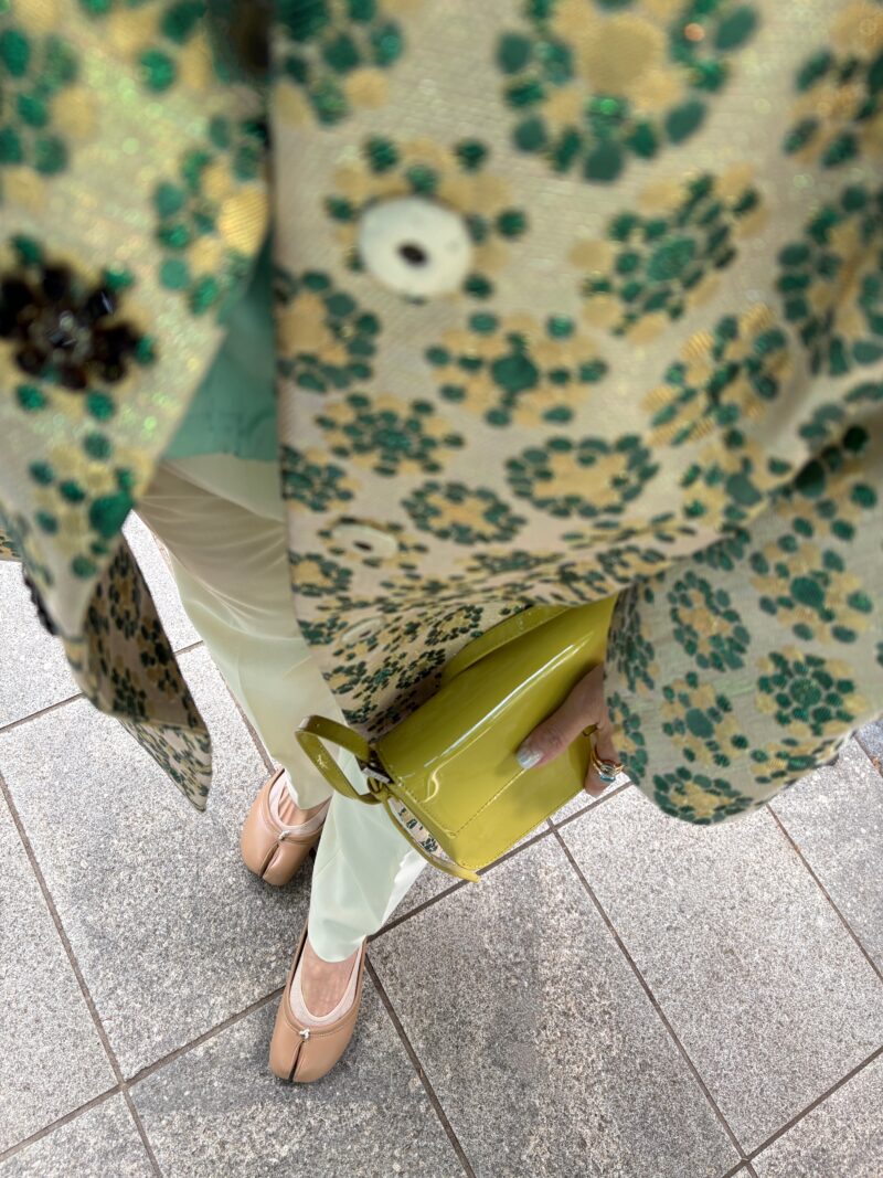 DOLCE & GABBANAのジャガードコートのコーデその2。コートの中の色から今日は緑色を取ってTOPSの色に採用。