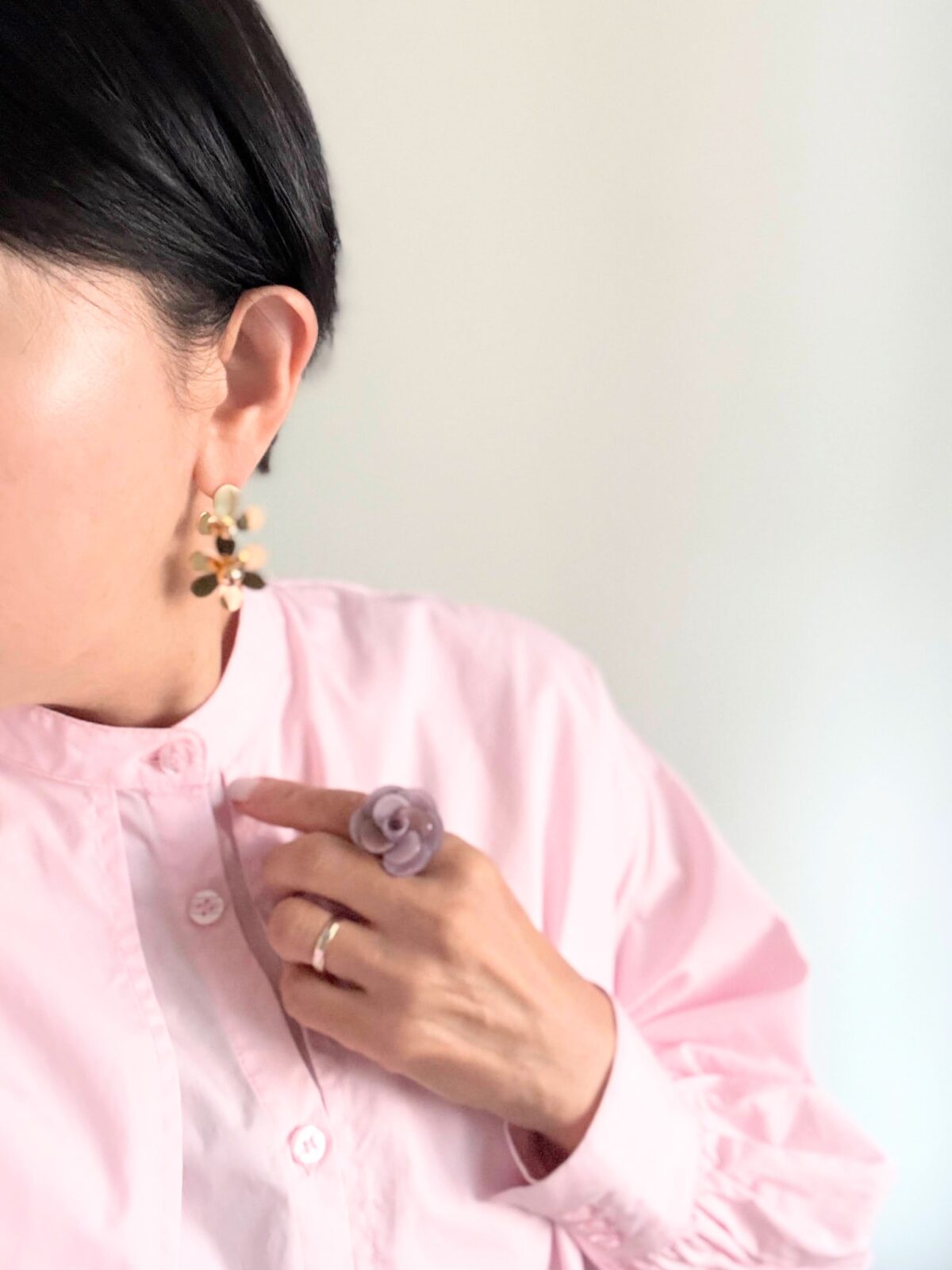 アクセサリー。花のピアスと藤色の花の指輪で。訪問先と絡めたコーデで気分盛り上げましょ!