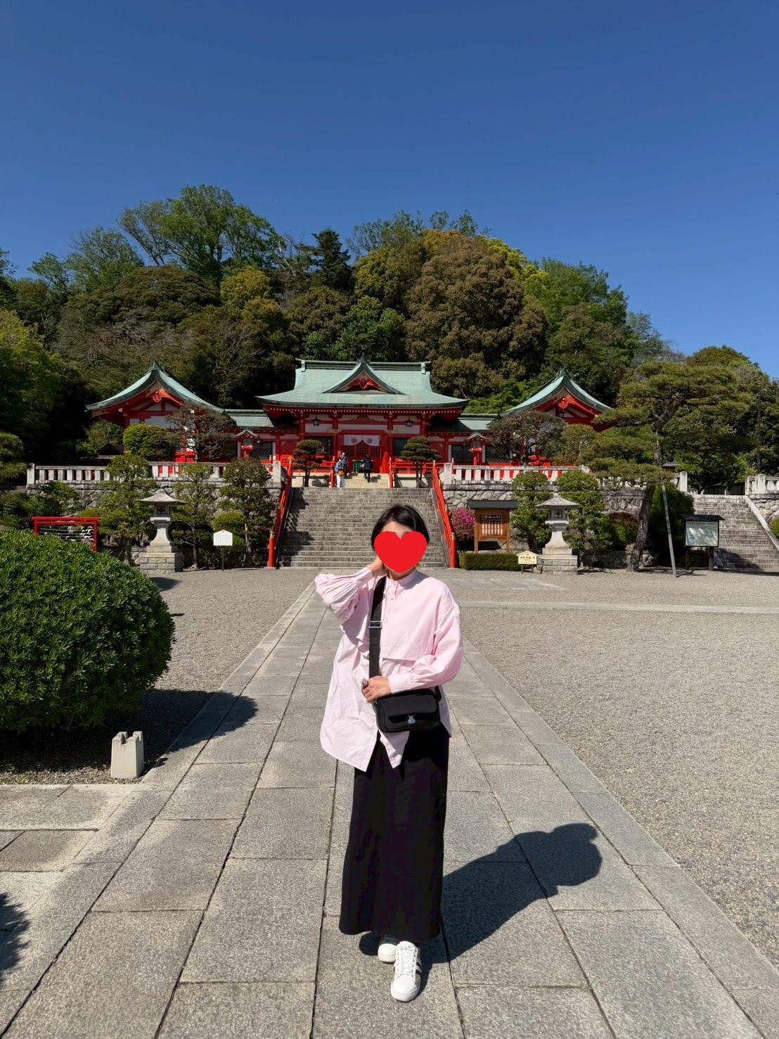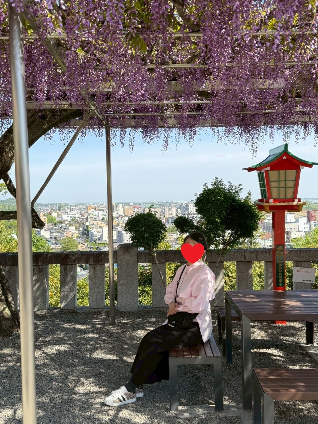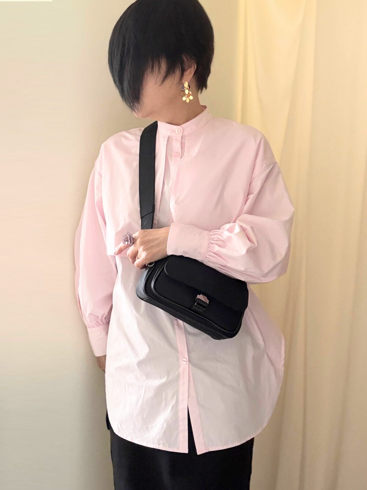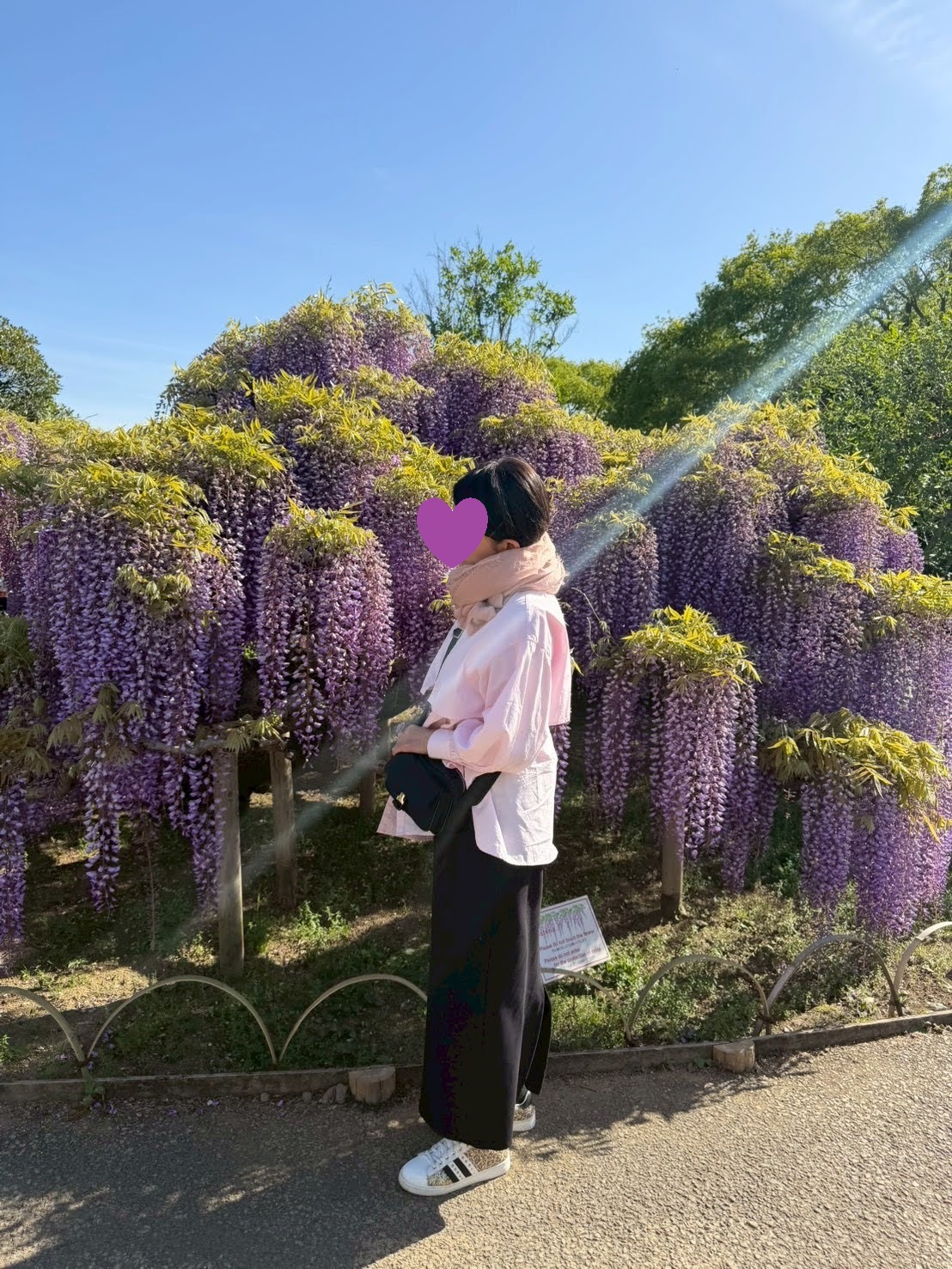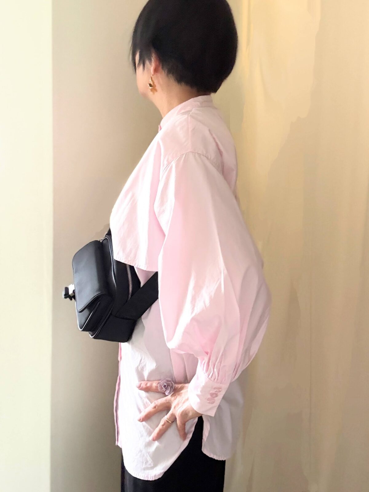 今年は「藤の花」がメインなので、藤色の服を・・・と思ったものの、この季節に合うアイテムでドンピシャ藤色が無かったのでこちらのピンク色のシャツで。桜のお花見の時も着ていたバンドカラーのシャツ。