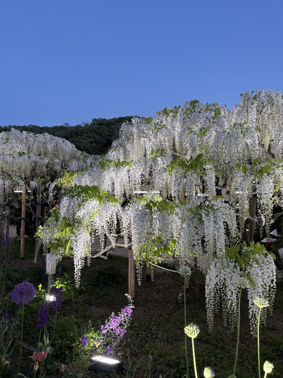 おおおおっ。昼とは全く違った表情を見せる色々な色の藤の花。妖艶。
