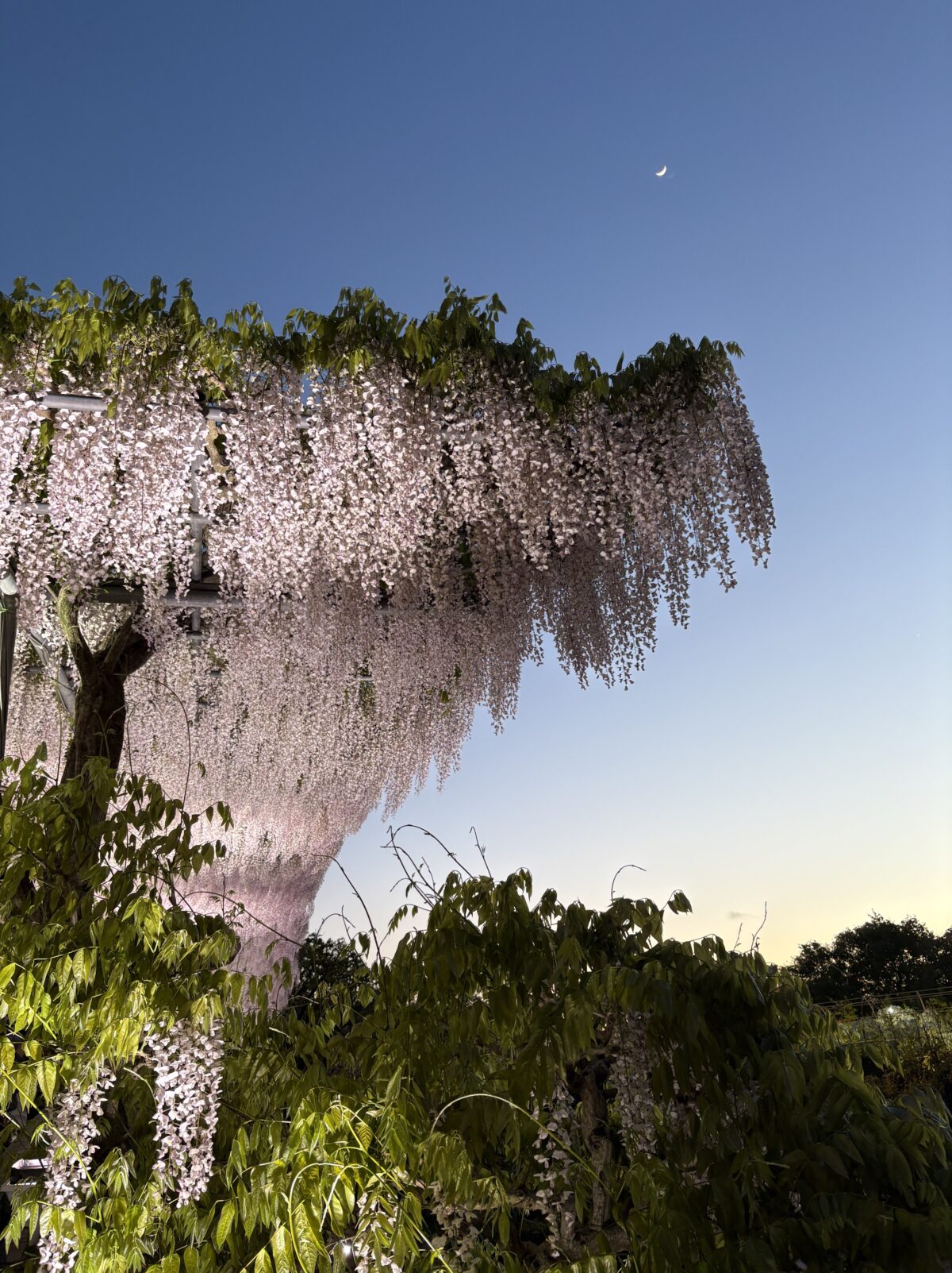 三日月と藤の花。夜風にゆらゆらと揺れる藤棚の花たち。可憐すぎる!
