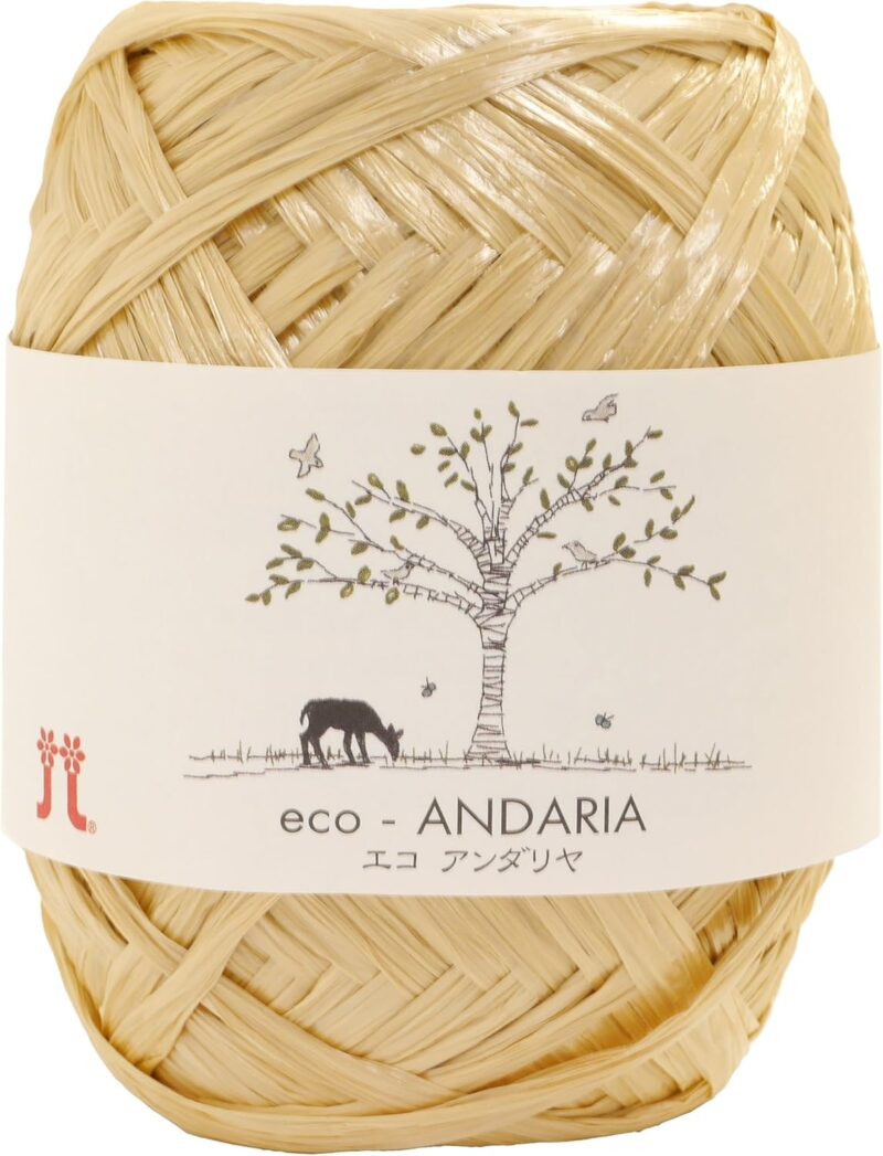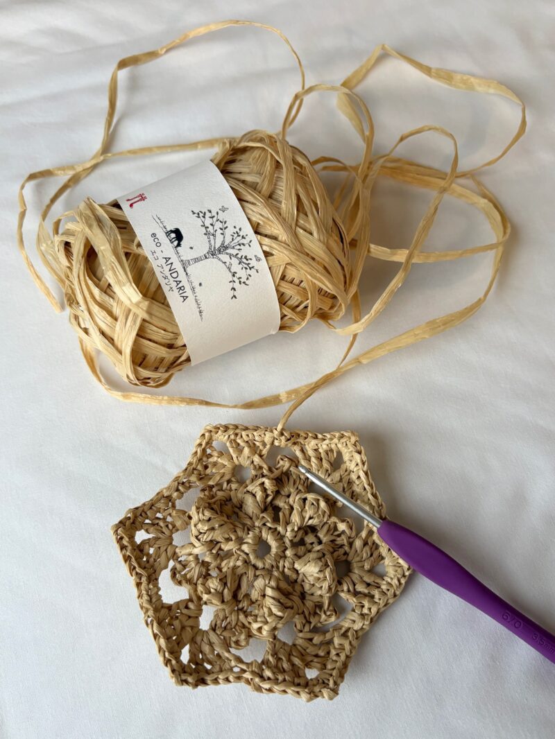 ハマナカの「エコアンダリヤ」という有名なレーヨン性の再生素材。ラフィア?藁?みたいな感じの質感なのでカゴバッグっぽいbagが自分で編める。