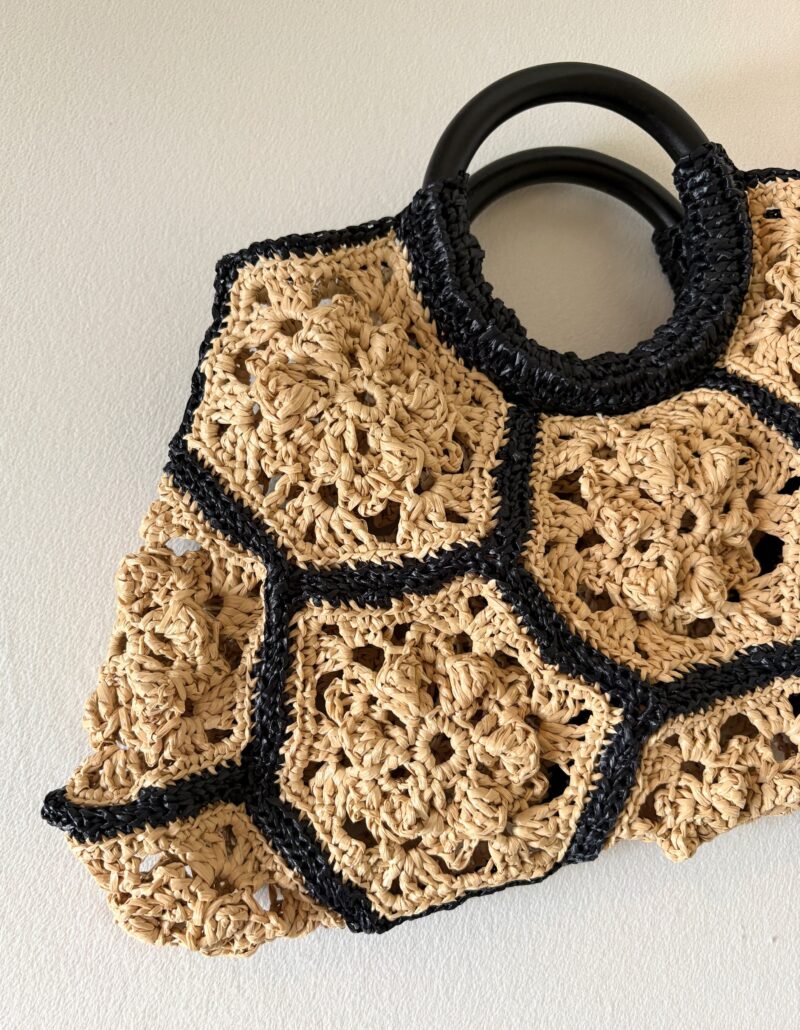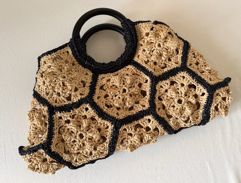 この本の中の「六角形モチーフのハンドバッグ」を制作。エコアンダリヤの23番(ナチュラル色)を3玉、30番(ブラック)を2玉使用した。材料費は3500円ぐらいかな?エコアンダリヤは今回は手芸店で買ったけど、今はAmazonでも簡単に手に入る。