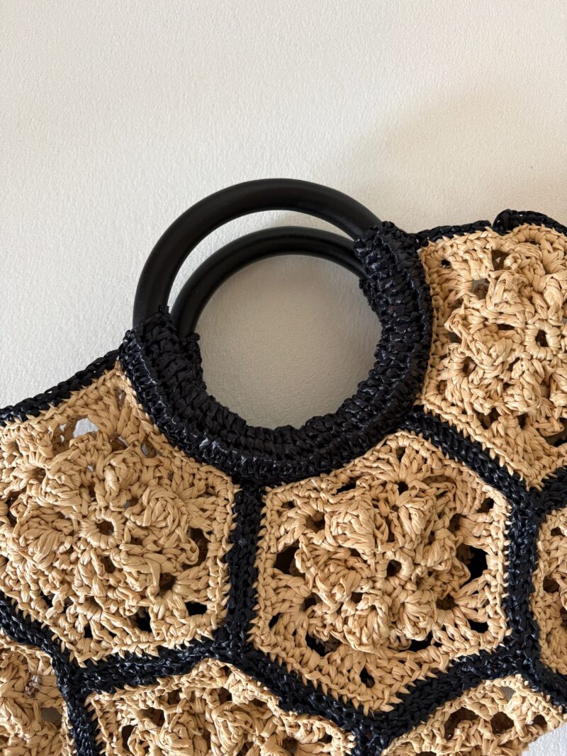 こちらの6角形のモチーフを沢山編んで繋げて作るbag。黒の木製のハンドルが素敵だなーと本を見て即制作決定。おソロで帽子も編める。