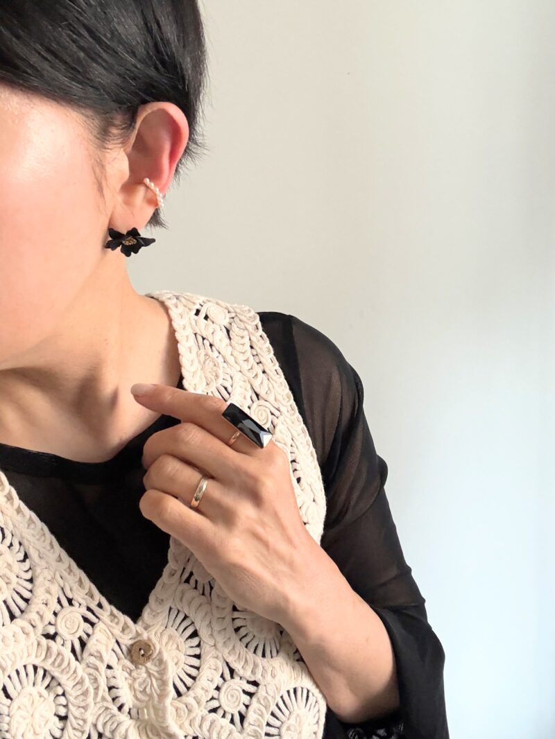 アクセサリー。今日は絶対黒いアクセサリーがいいですね。ピアスも指輪も黒で。