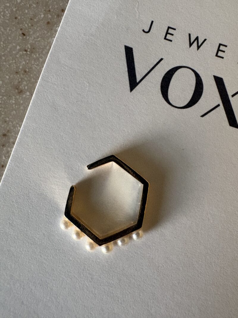 珍しい六角形の形のイヤーカフ。この角角した形が引っ掛かりやすくて逆に耳たぶでしっかり固定される。