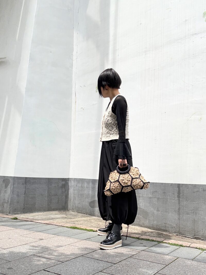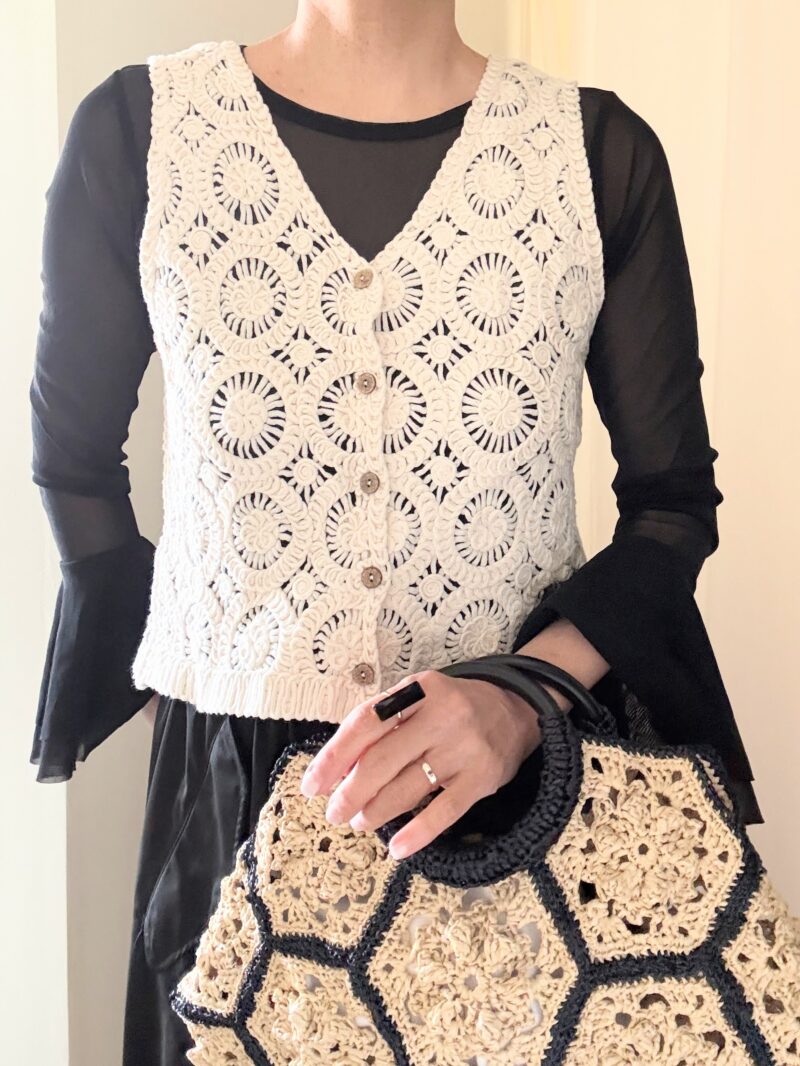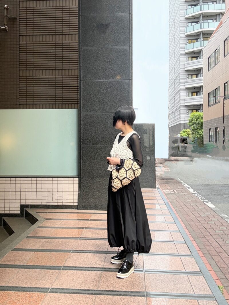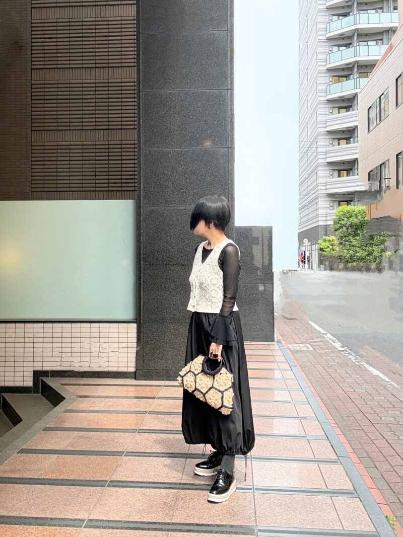 今日はこのbag持って、クロシェ(編み)のニットベスト合わせのコーデ。