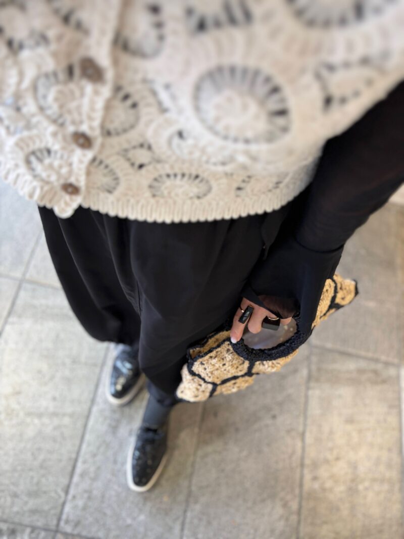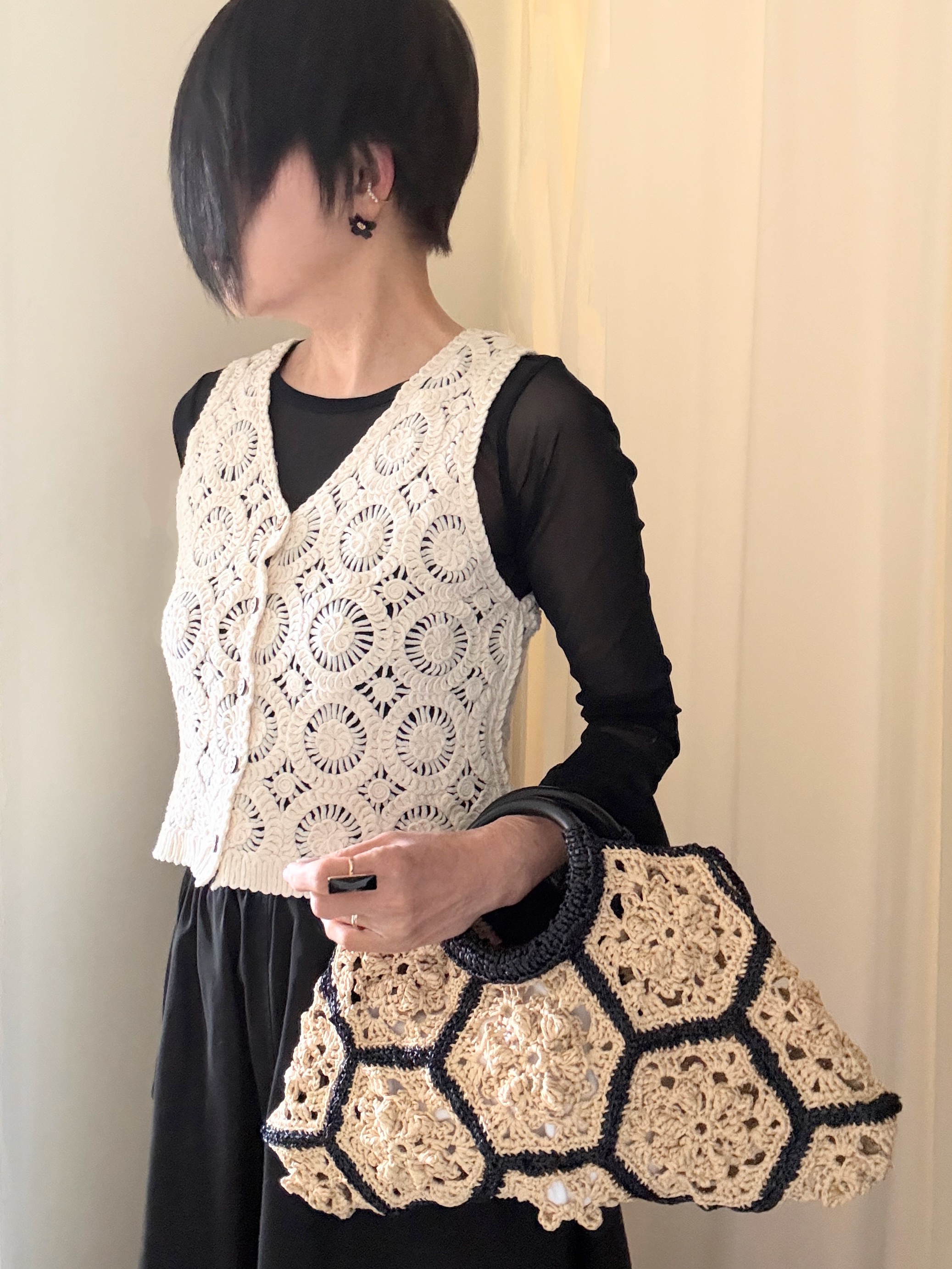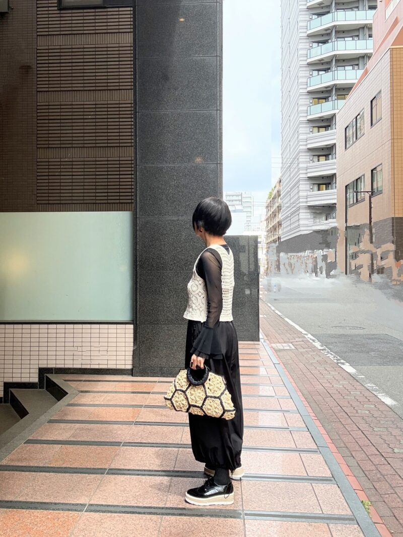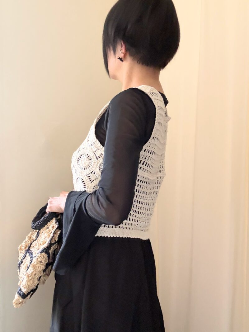 今日はこのbag持って、クロシェ(編み)のニットベスト合わせのコーデ。
